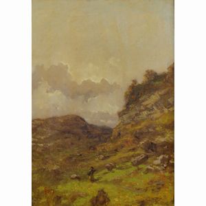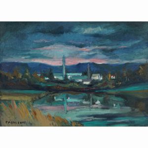65x44 cm. Modena 1862 - Porto Ceresio 1958 Paesaggio, olio su tela, firmato in basso a sinistra