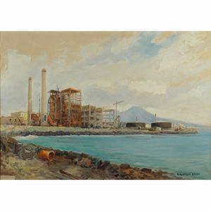 70x100 cm. Italia XX Sec. La centrale elettrica a Messina 1960, olio su tela, firmato e datato in basso a des [..]