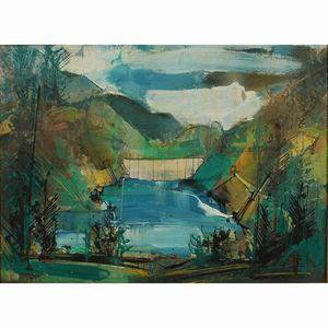 60x80 cm. Italia XX Sec. Serbatoio diga di Beauregard, olio su tavola, firmato in basso a destra