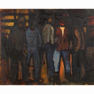 70x100 cm. Italia XX Sec. Donne davanti ad una diga 1961, olio su tela, firmato e datato in basso a sinistra