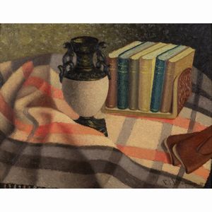 40x50 cm. Italia, XX Sec. Natura morta con vaso e libri, 1950, olio su tavola, firmato e datato in basso a destra, [..]