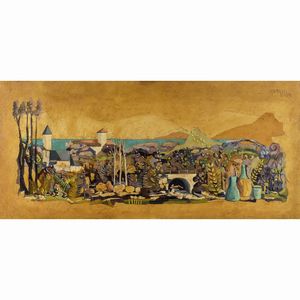 108x240 cm. Italia, XX Sec. Natura morta con sfondo di paesaggio, 1969, olio su tavola, firmato e datato in alto [..]