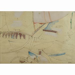48x68 cm. Italia, XX Sec. Paesaggio con diga, tecnica mista su cartoncino, siglato P M in basso a destra