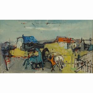 32x55,5 cm. Leini 1922 - Torino 2009 Maneggio, 1953, olio su tela, firmato in basso a sinistra