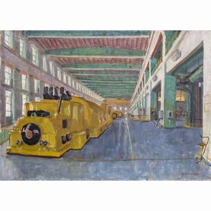 50x70 cm. Saronno 1902 - Milano 1978 Interno di fabbrica, olio su tela, firmato in basso a destra