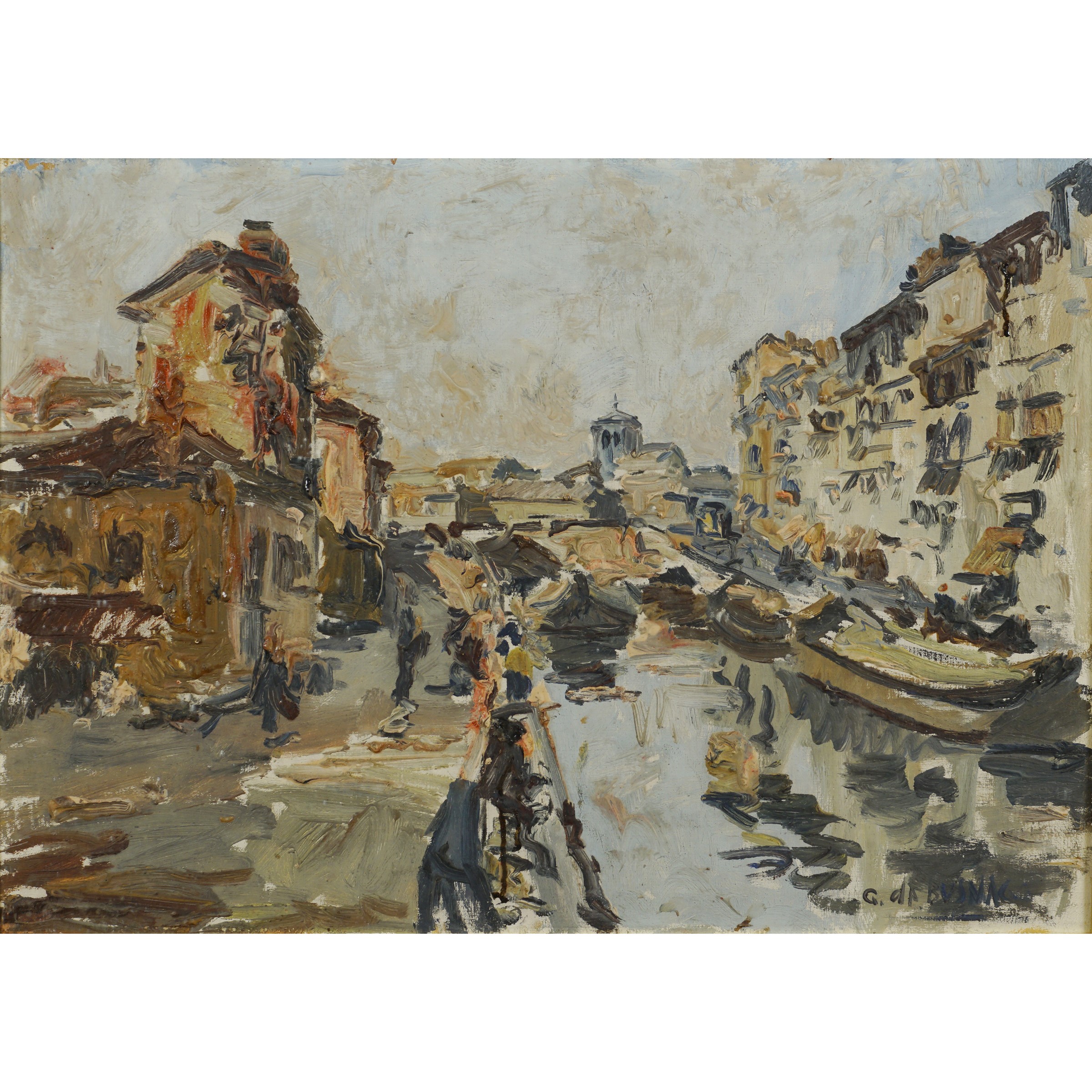 Busnago 1908 - Gaggiano 1972 Canale di barche a Caorle, olio su tela, firmato in basso a destra