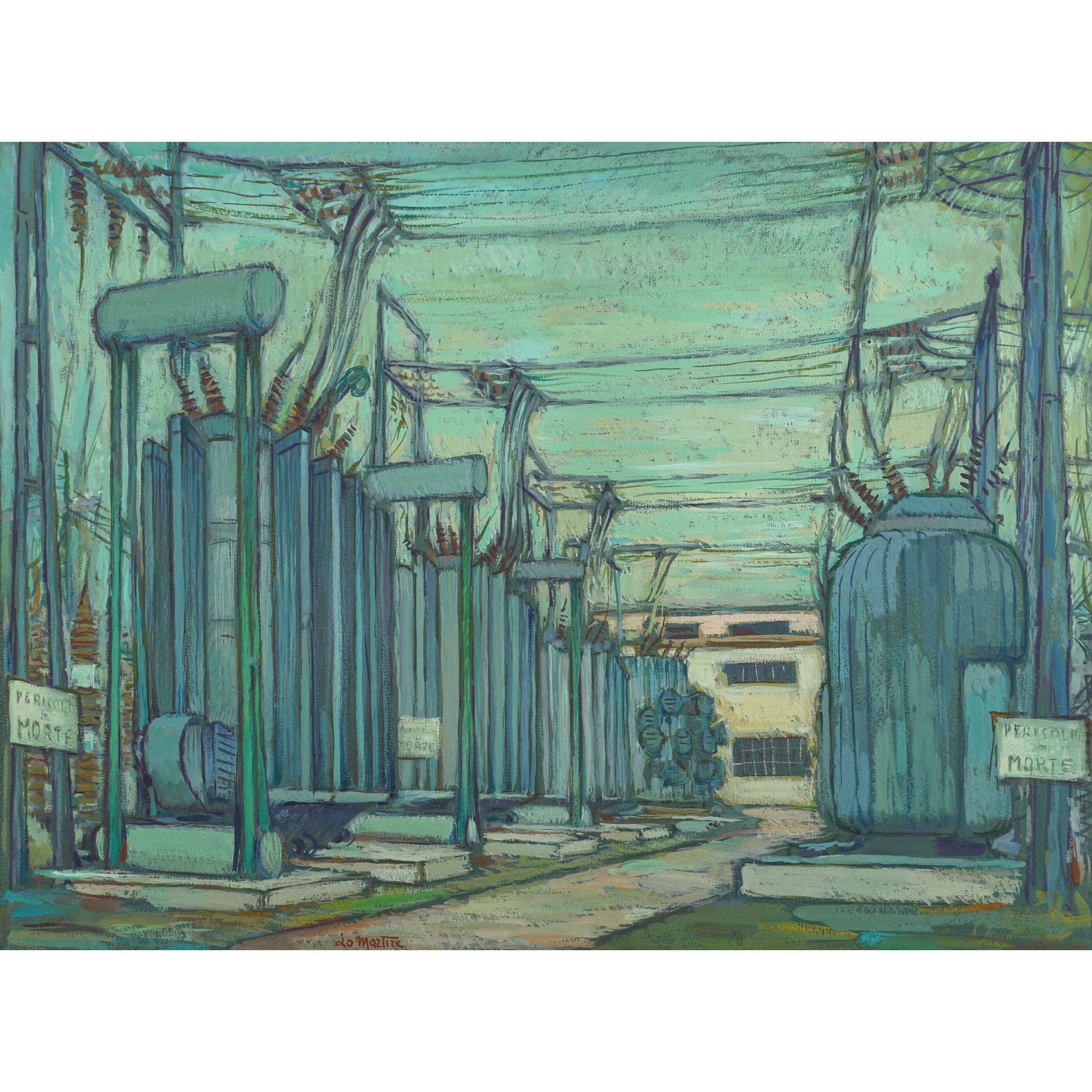 Italia XX Sec. Stazione di trasformazione della centrale di Chivasso, tempera su cartoncino, firmato in basso a sinistra