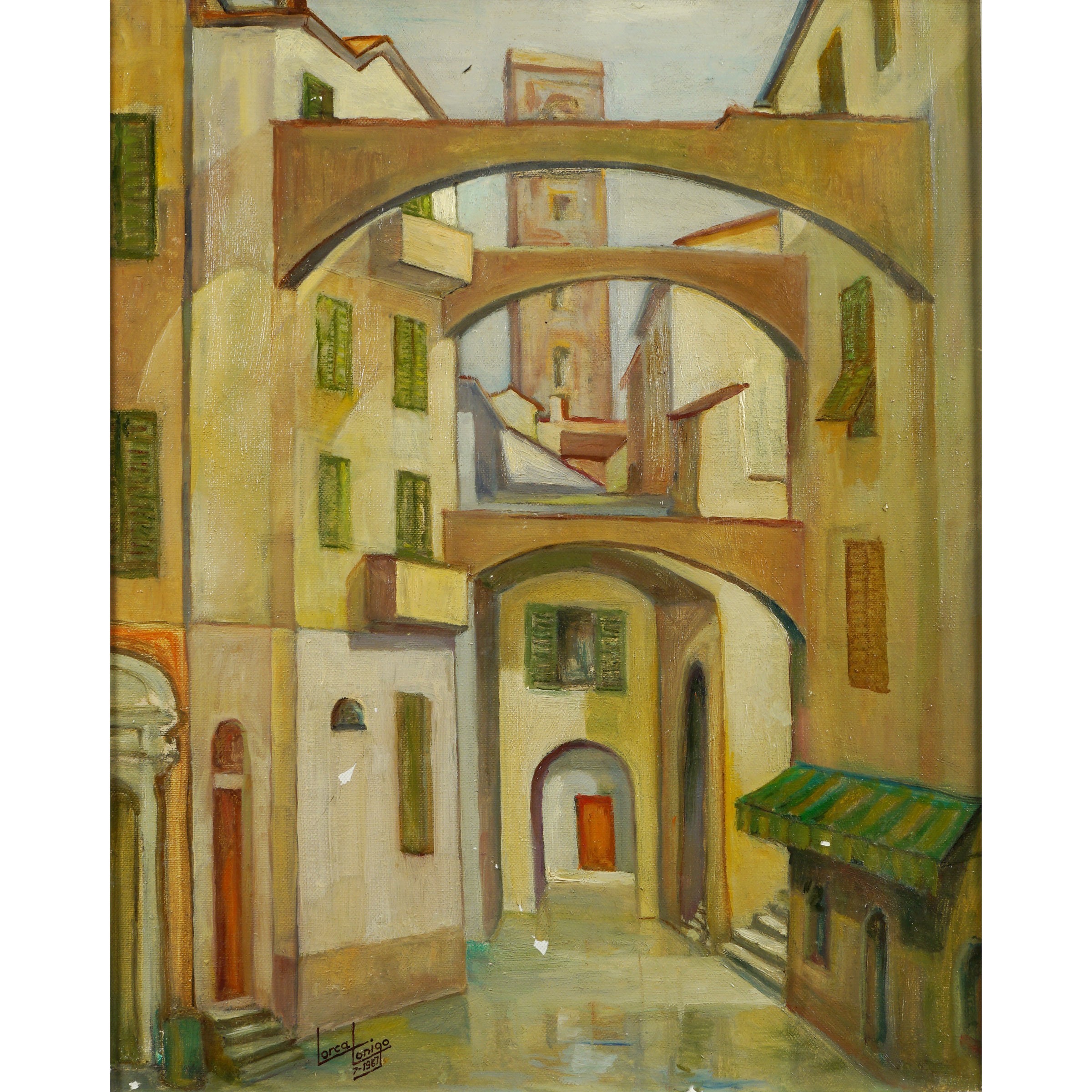Italia XX Sec. Scorcio di paese, 1987, olio su tela, firmato e datato in basso a sinistra, alcune cadute di colore