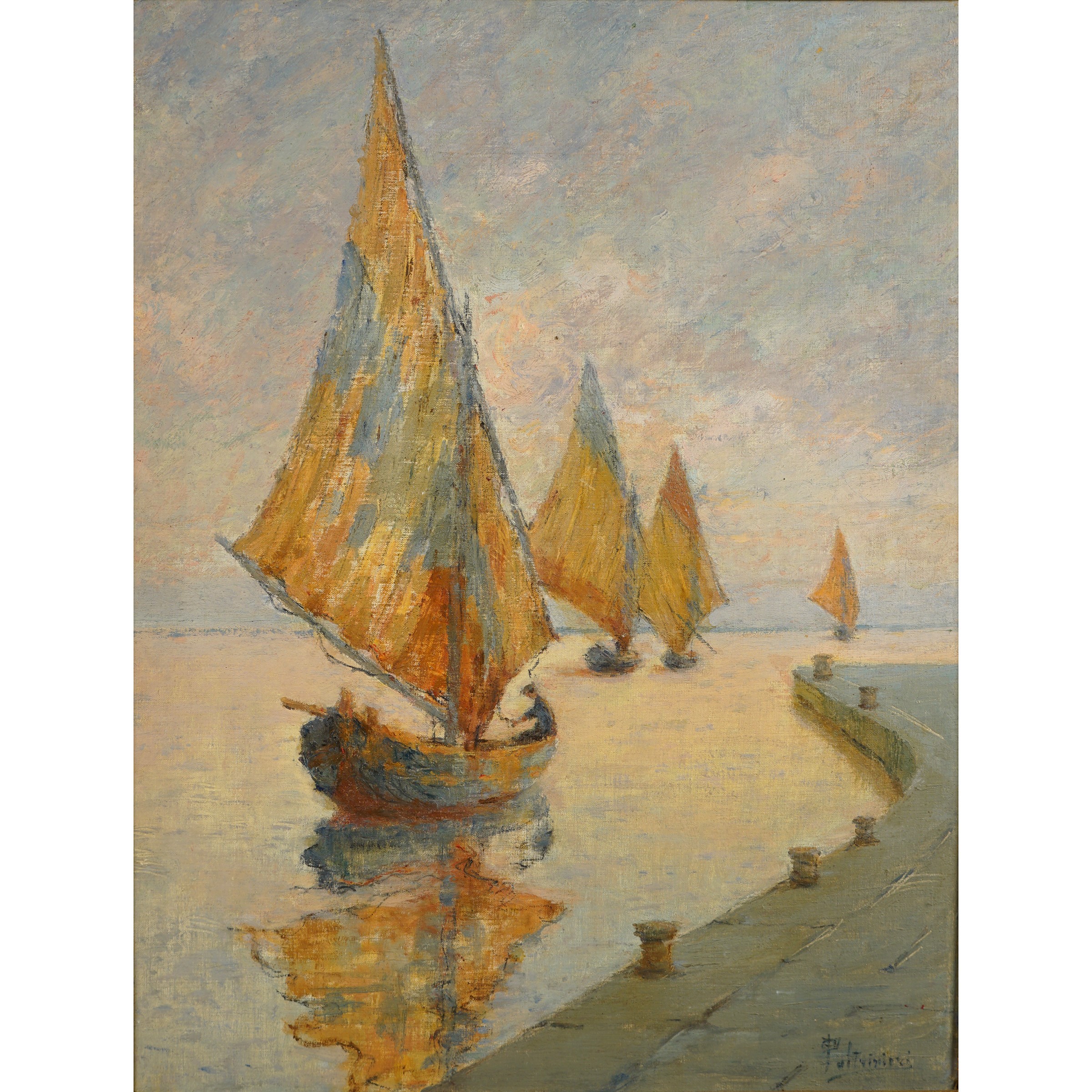 Verona 1873 - Viareggio 1966 Vele latine, olio su tavola, firmato in basso a destra
