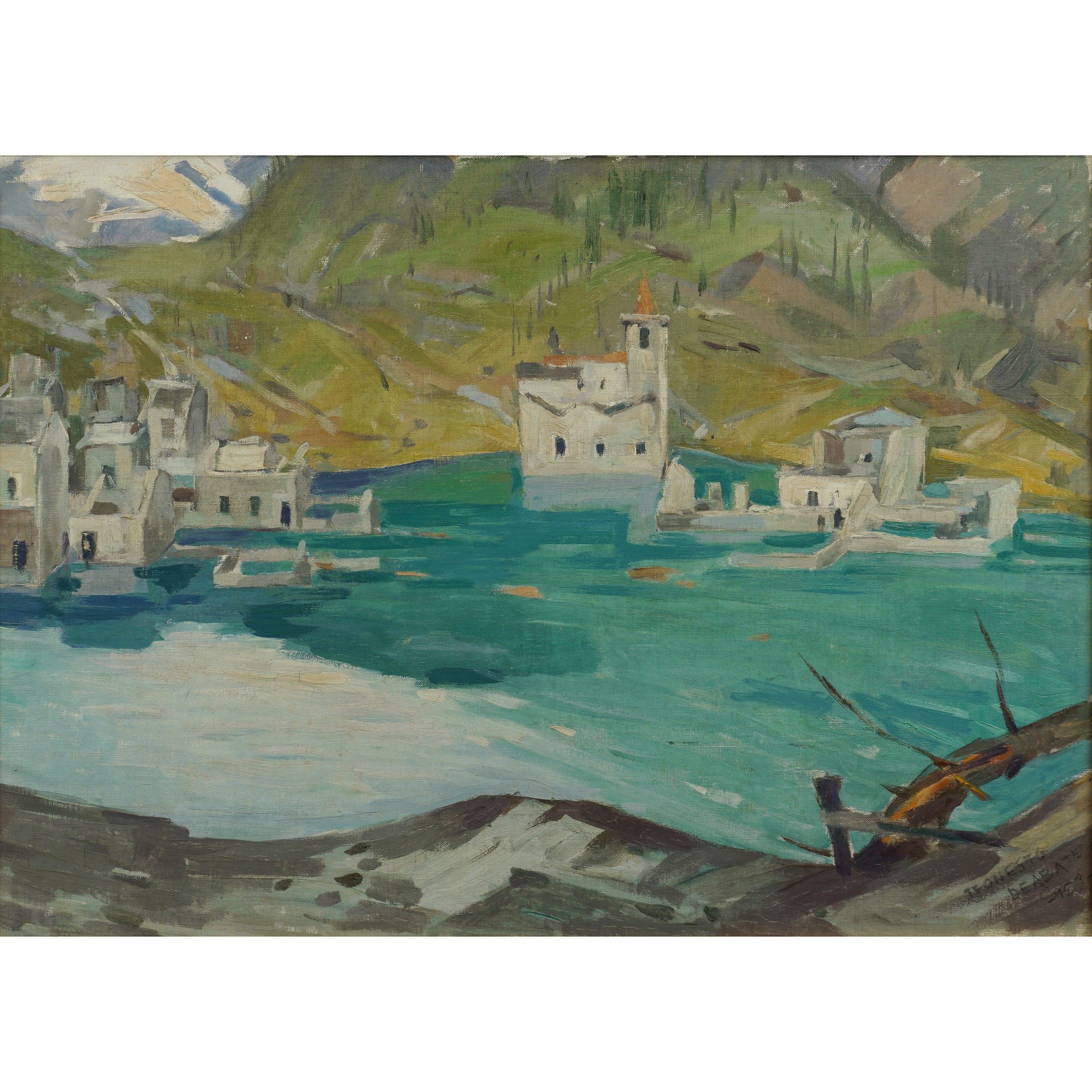 Torino 1898 - 1981 Case sommerse dal serbatoio di Beauregard, 1959, olio su tela, firmato in basso a destra
