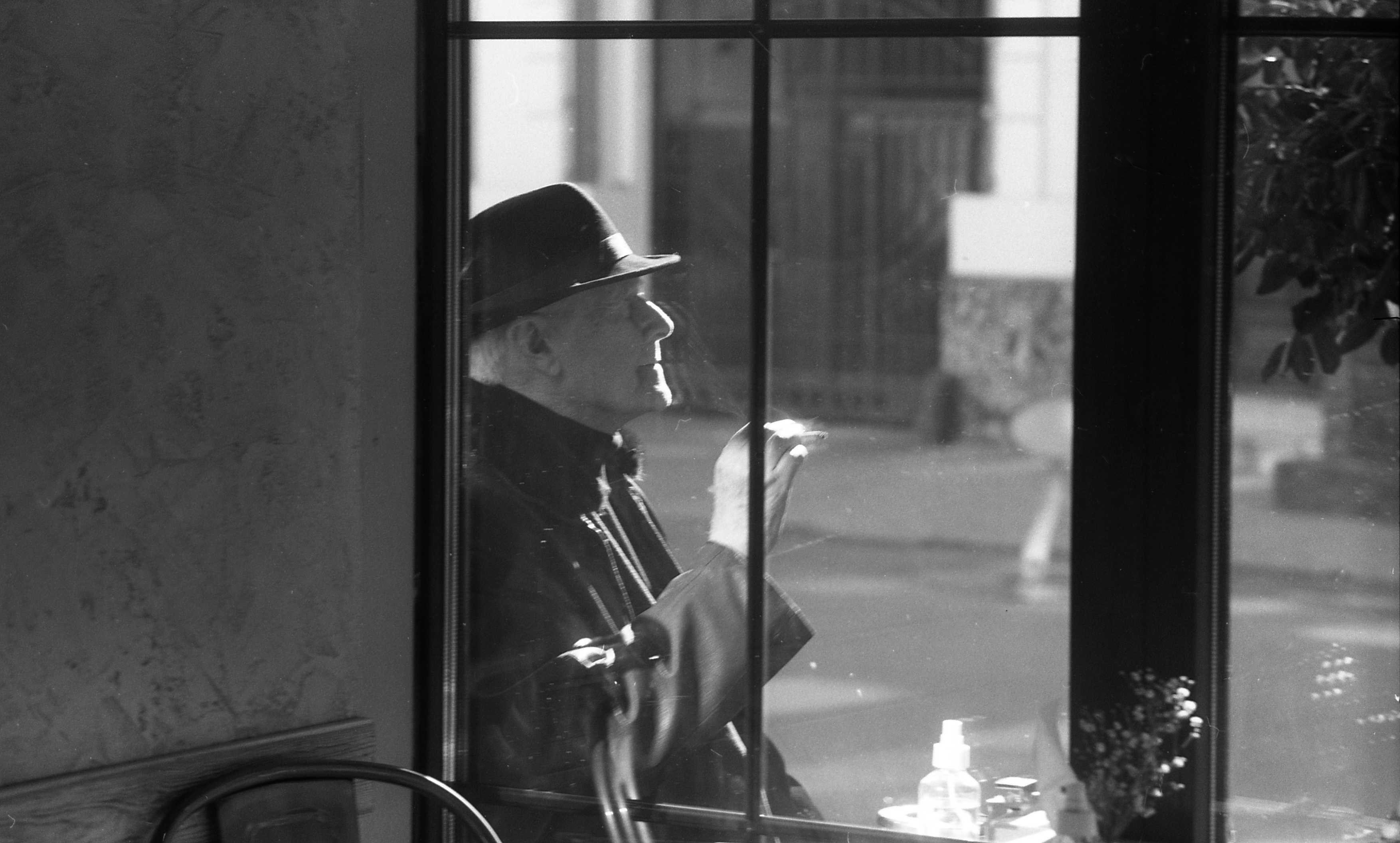 Un signore fuori dal caffè Croissant, sulla via Landzheronovskaja, si accende una sigaretta