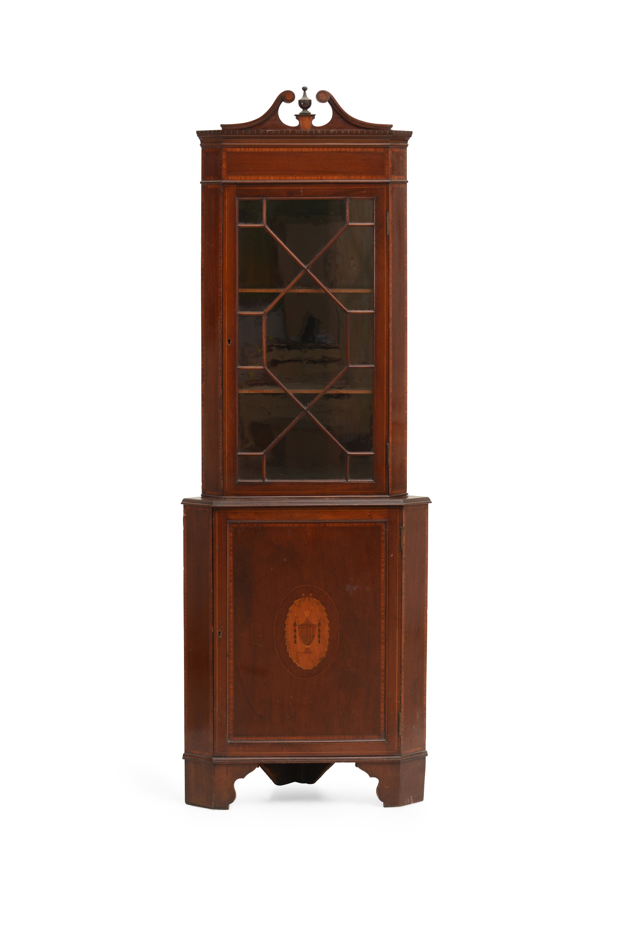 Angoliera a due corpi in mogano, parte sottostante con anta intarsiata in altri [..]