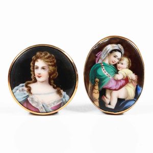 Coppia di spille con ritratto femminile e Madonna con bambino