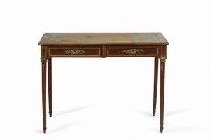 Bureau-plat in mogano con piano rivestito in cuoio, due cassetti sottostanti finiture [..]
