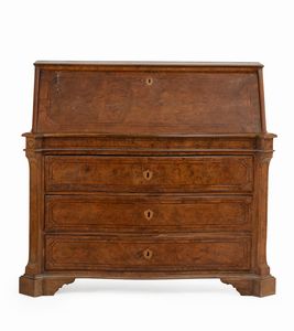 Cassettone a ribalta in noce e radica di noce con intarsi a profilature. Napoli, [..]