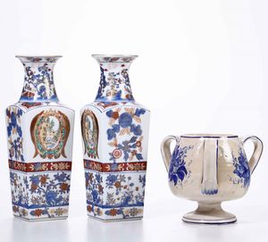 Coppia di vasi in porcellana, Cina XX secolo e vaso a tre anse