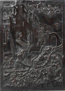 Placca in bronzo con scena del riposo dalla fuga in Egitto tratta da un' incisione [..]