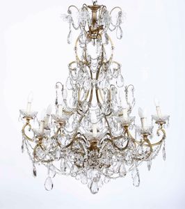 Lampadario a 12 luci in metallo dorato e cristalli. XIX-XX secolo