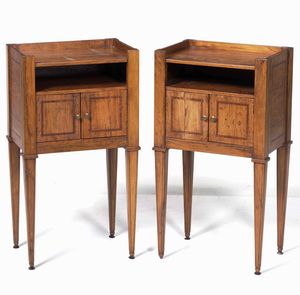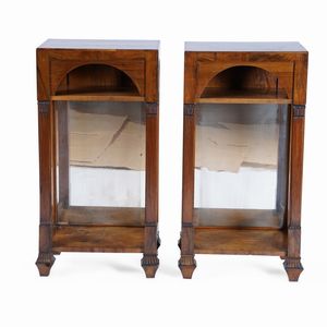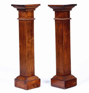 Coppia di comodini a colonna in mogano con piani in marmo. XIX secolo