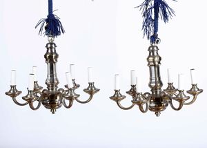 Coppia di lampadari a dodici luci in metallo dorato e pendenti in cristalli. XIX-XX [..]