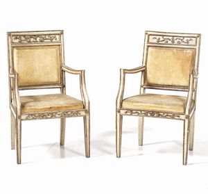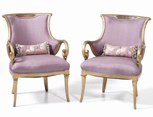 Coppia di poltrone in legno laccato e dorato, XIX-XX secolo