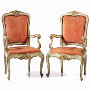 Coppia di poltrone in legno intagliato, laccato XVIII-XIX secolo
