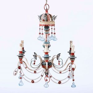 Lampadario a otto bracci con pendenti in vetro incolore e policromo. XX secolo