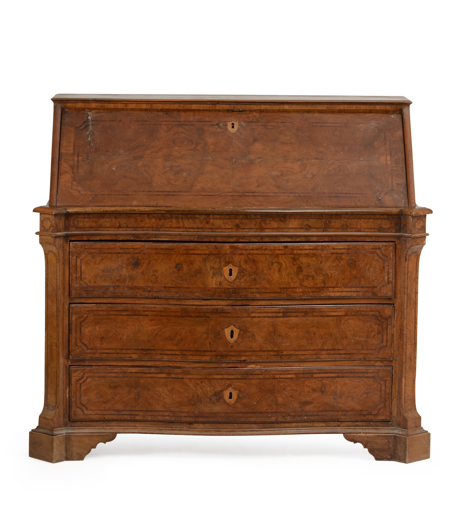 Cassettone a ribalta in noce e radica di noce con intarsi a profilature. Napoli, [..]