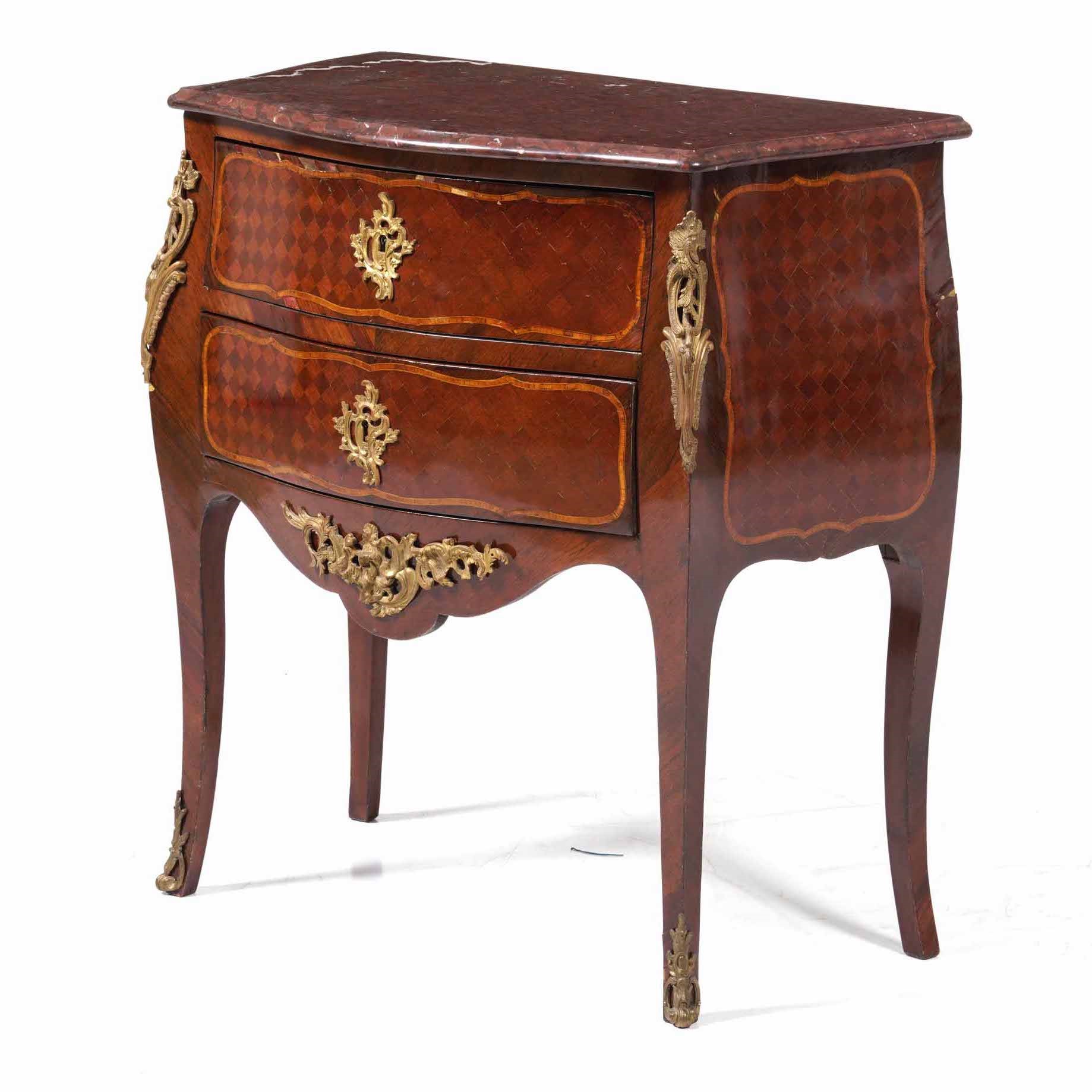 Commode in legno lastronato ed intarsiato a marqueterie e filettato. XIX secolo