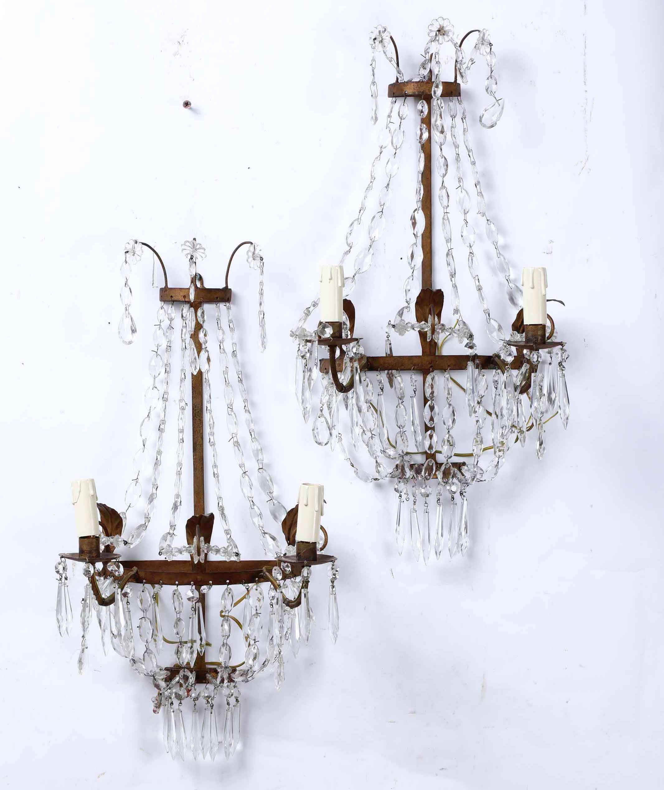Coppia di applique in metallo e cristalli a due luci. XIX secolo