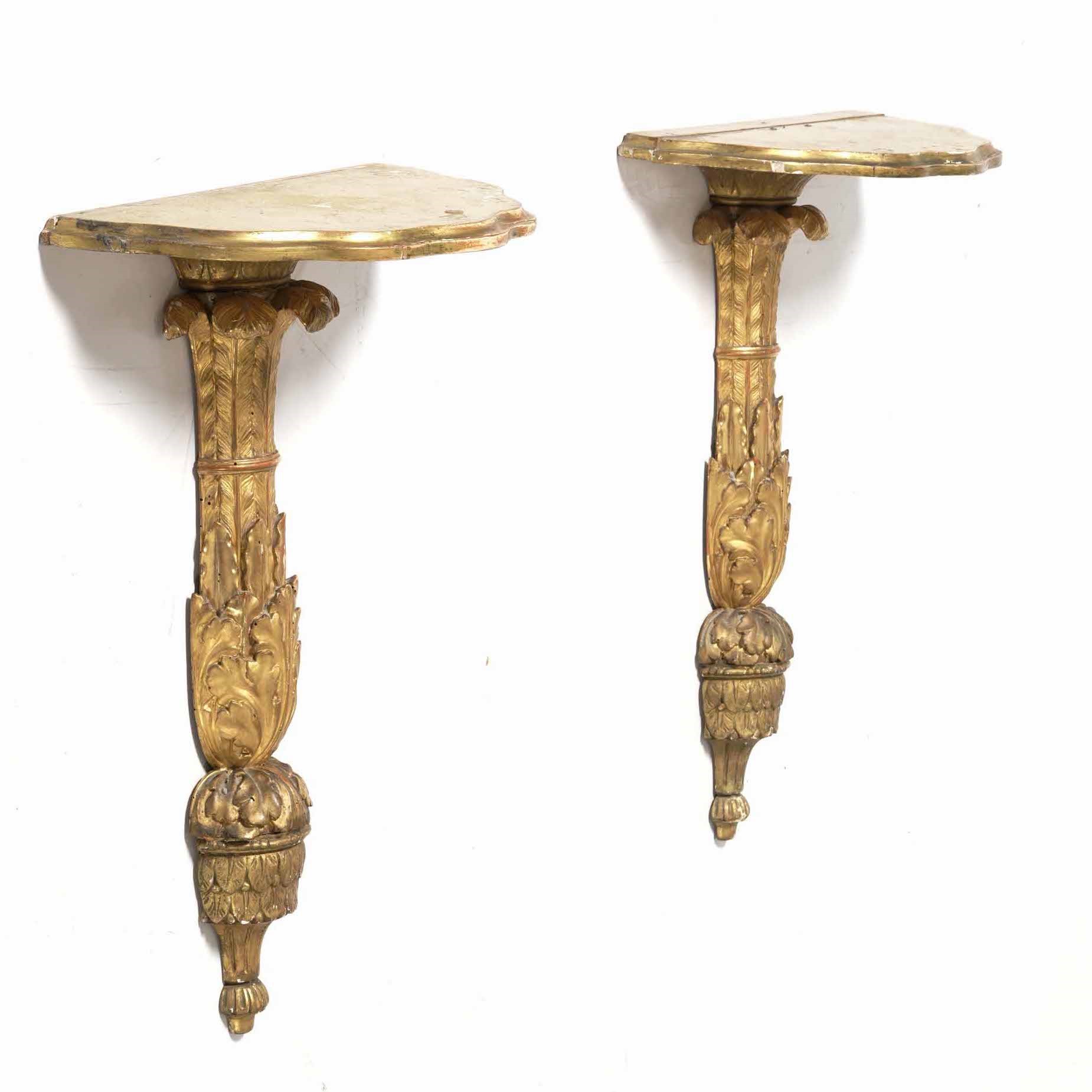 Coppia di comodini pensili in legno intagliato e dorato a motivi fogliati, XX se [..]