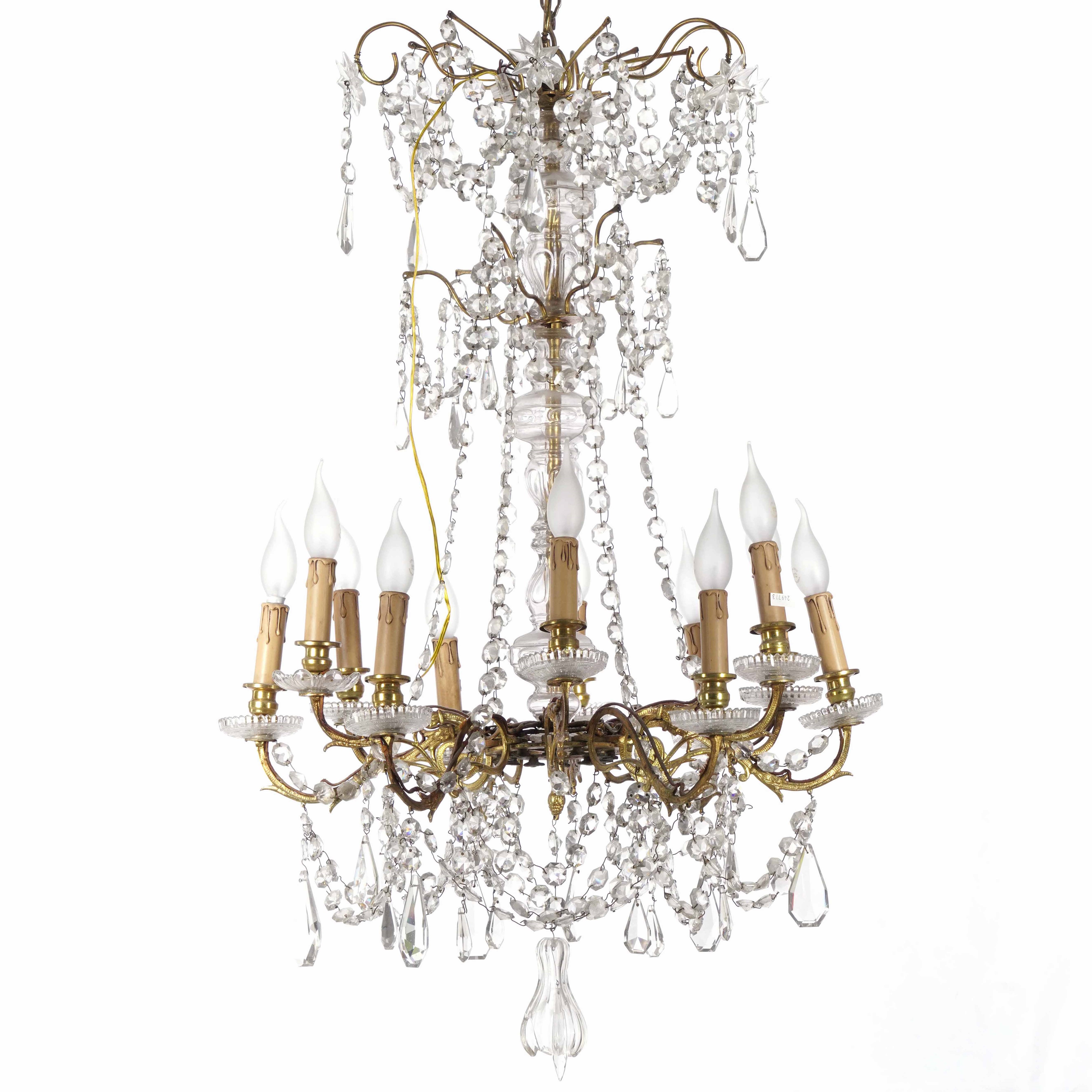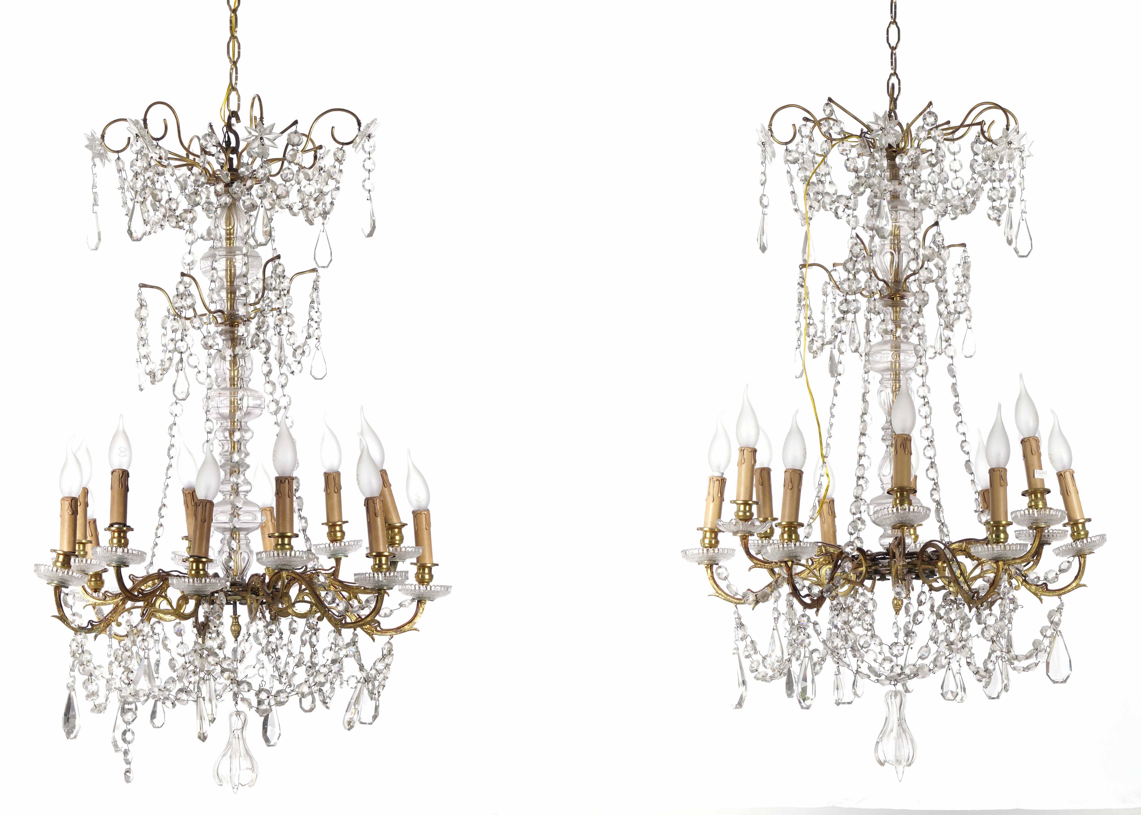 Coppia di lampadari a dodici luci in metallo dorato e pendenti in cristalli. XIX-XX [..]