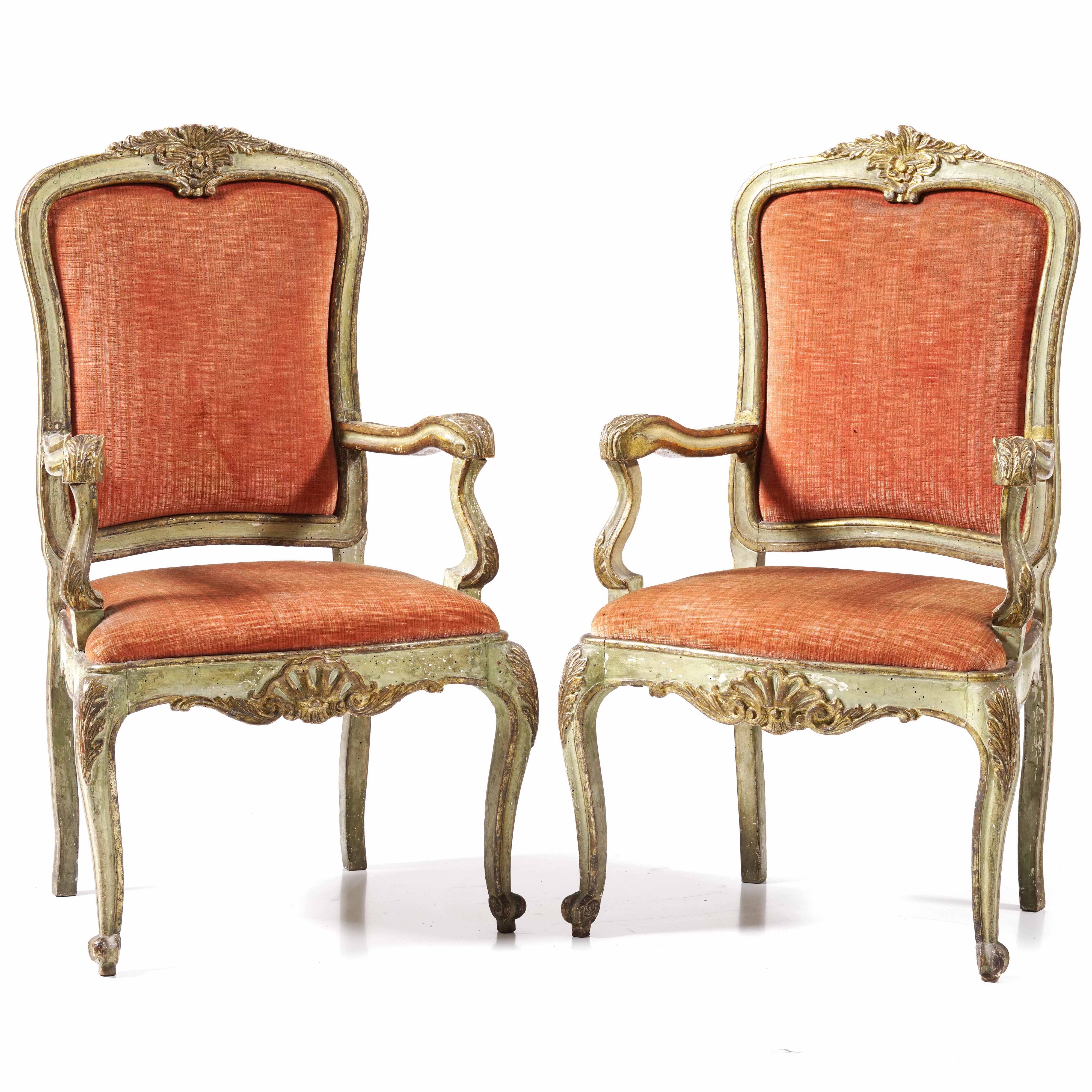 Coppia di poltrone in legno intagliato, laccato con profili dorati. XVIII secolo