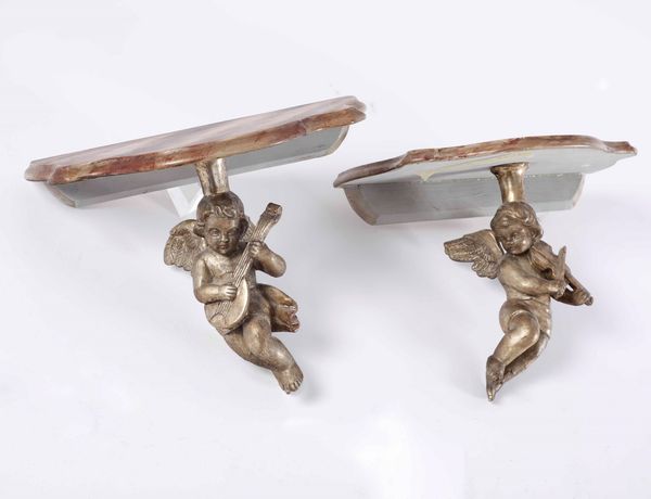Coppia di putti suonatori in legno intagliato e dorato con mensola laccata a finto [..]