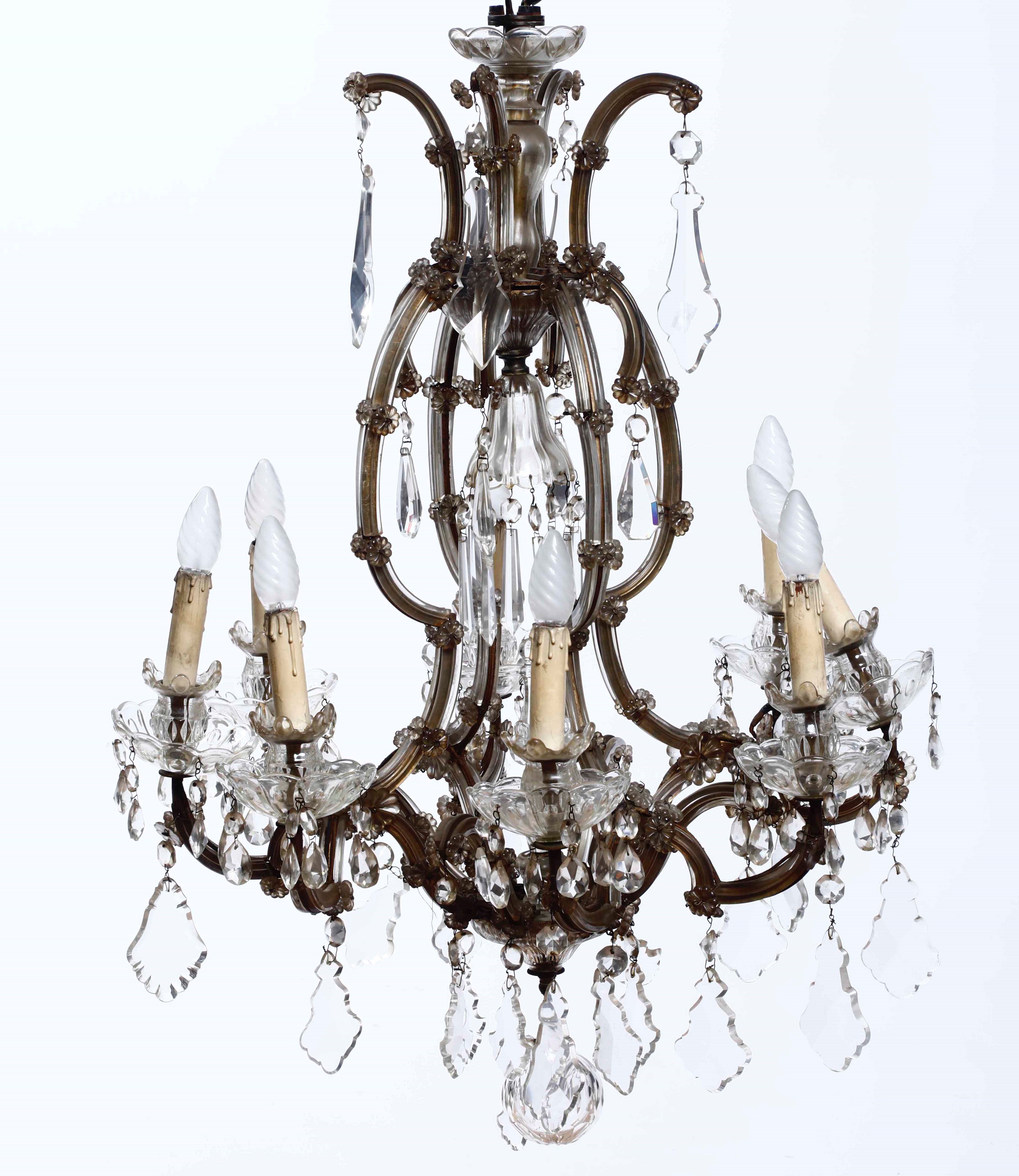 Lampadario a otto luci con struttura in ottone, vetro incolore, bobeches e pendenti. [..]