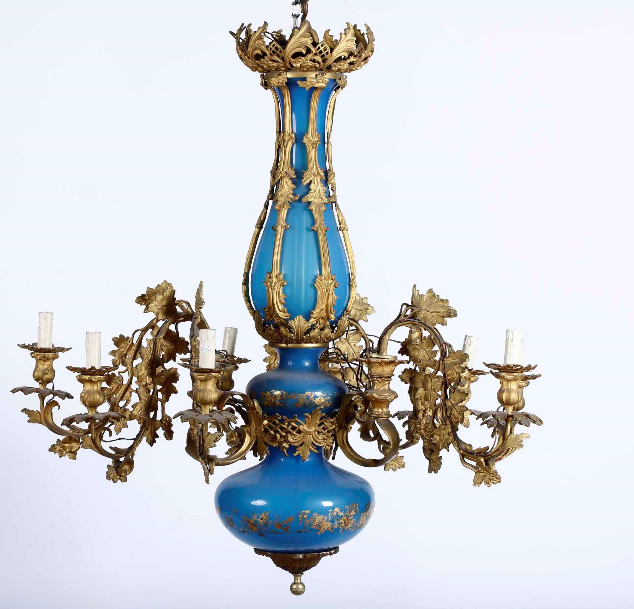 Lampadario in bronzo dorato e vetro blu decorato in oro