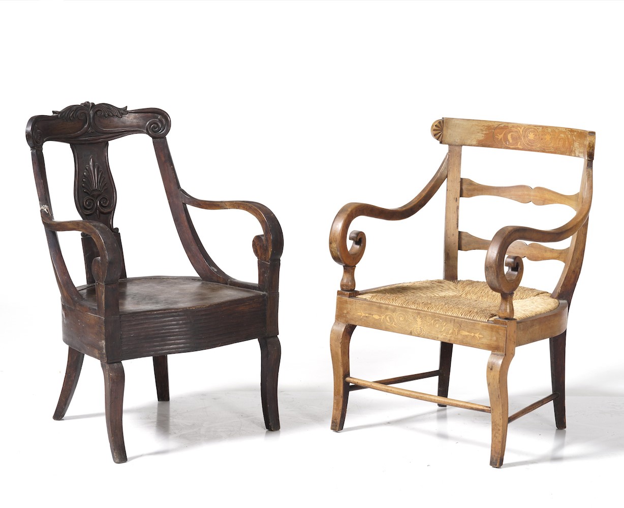 Lotto di due poltrone diverse con braccioli a ricciolo