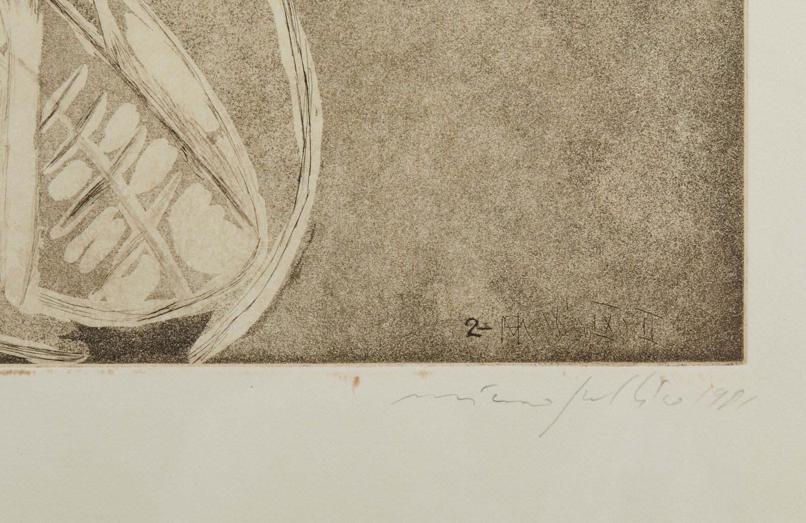 47/50. Tiratura, firma e anno in basso a matita. Timbro a secco in basso a sinistra Il Torchio Modenese Stamperia Artistica. Dimensione lastra: 66x49cm. Lievi difetti.