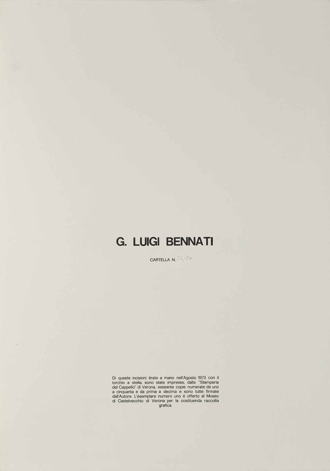 26/50. Tiratura e firma in basso a matita. Timbro a secco Comune di Verona Musei d'arte. Dimensioni lastre: 42,5x27,5 cm, 45x27,5 cm, 42x28 cm. Edizione totale: 60 esemplari numerati da 1 a 50 e 10 esemplari numerati I a X.