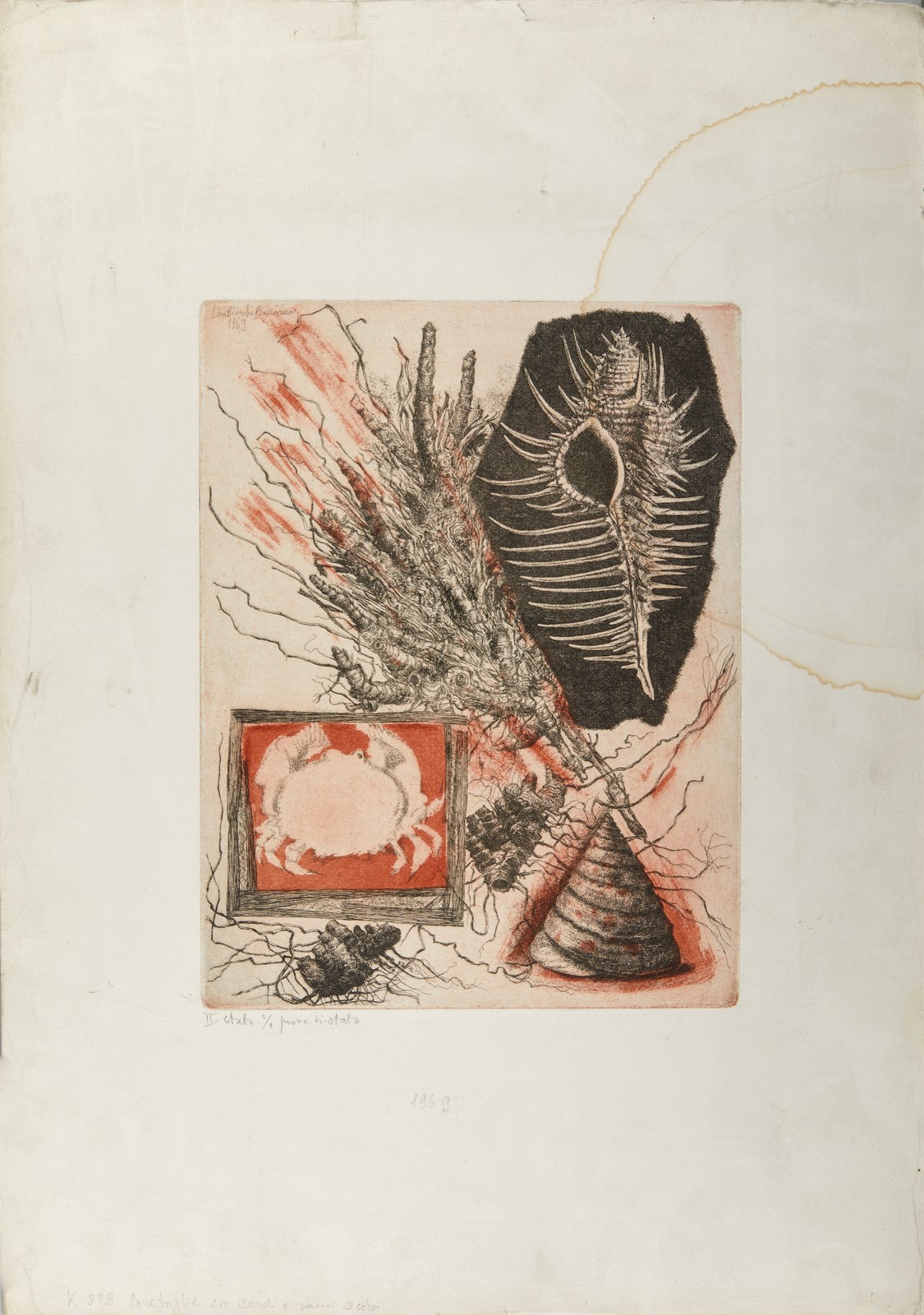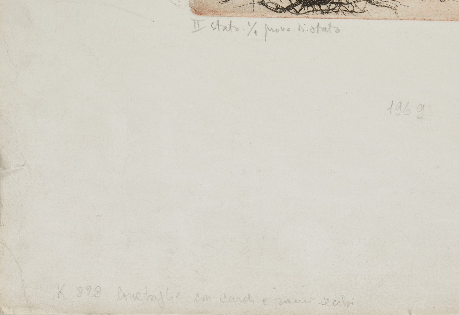 1/9. Prova di stato. II stato. Firma e anno in alto a sinistra su lastra. Tiratura, titolo e anno in basso a matita. Dimensione lastra: 37,5x28,7cm. Difetti.