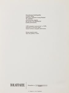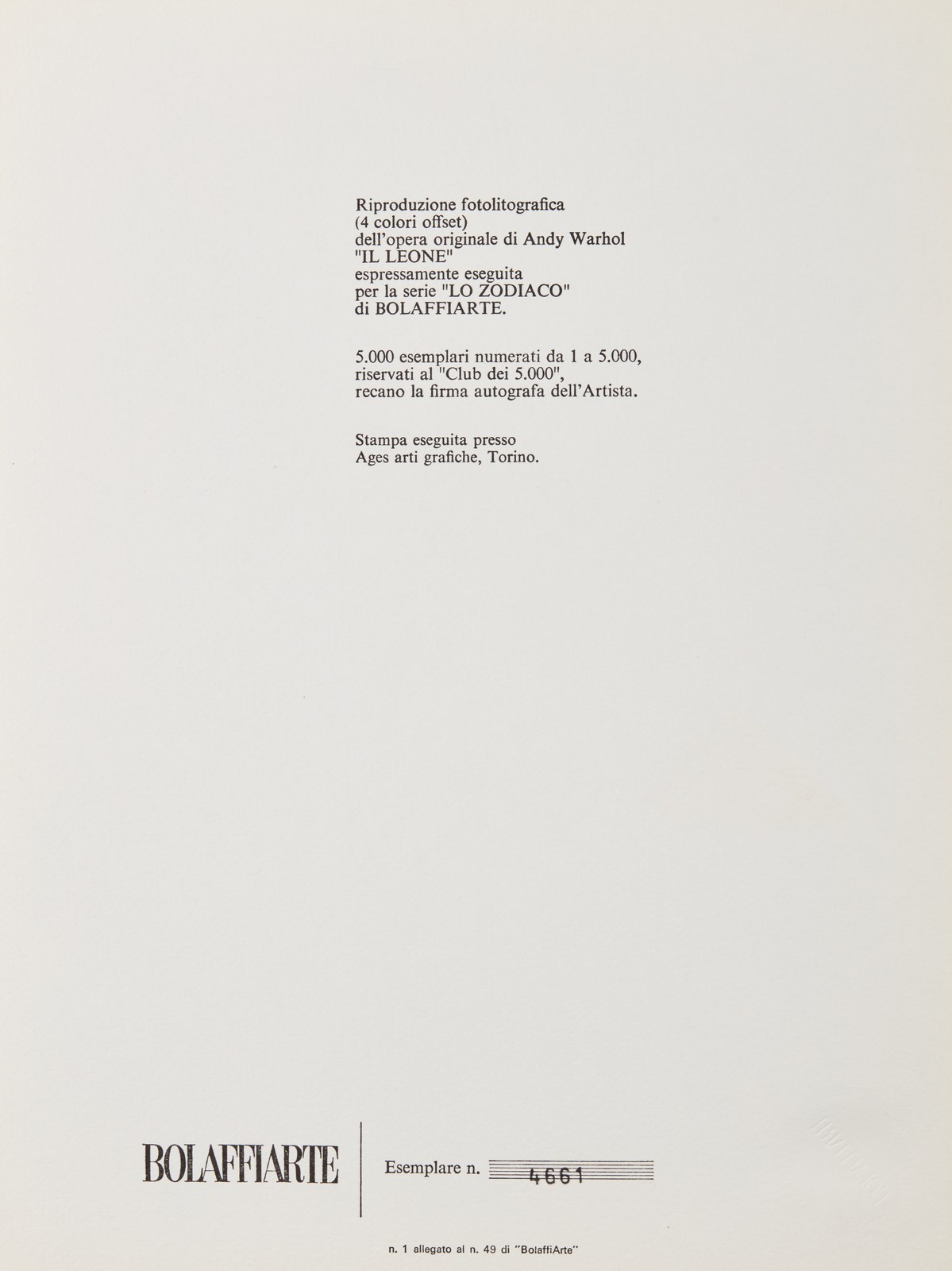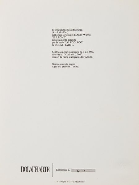4661/5000. Firma in basso a destra a matita. Edizione al retro. Timbro a secco Bolaffi Arte in basso a sinistra. Edizione totale: 5000 esemplari numerati da 1 a 5000 riservati al Club dei 5000 con firma dell'artista. Stampatore: Ages Arti grafiche, Torino.
