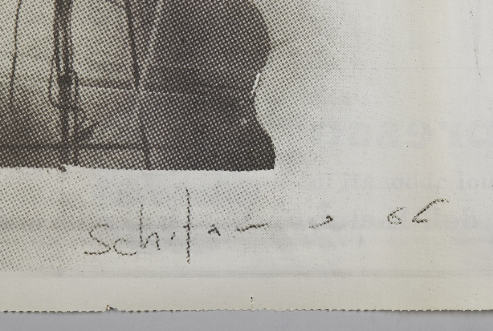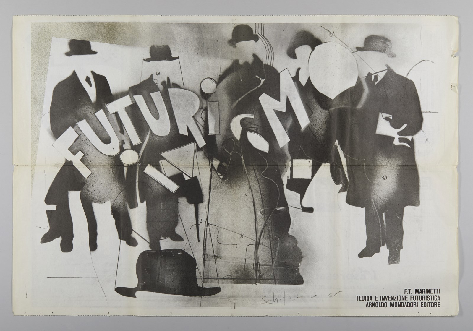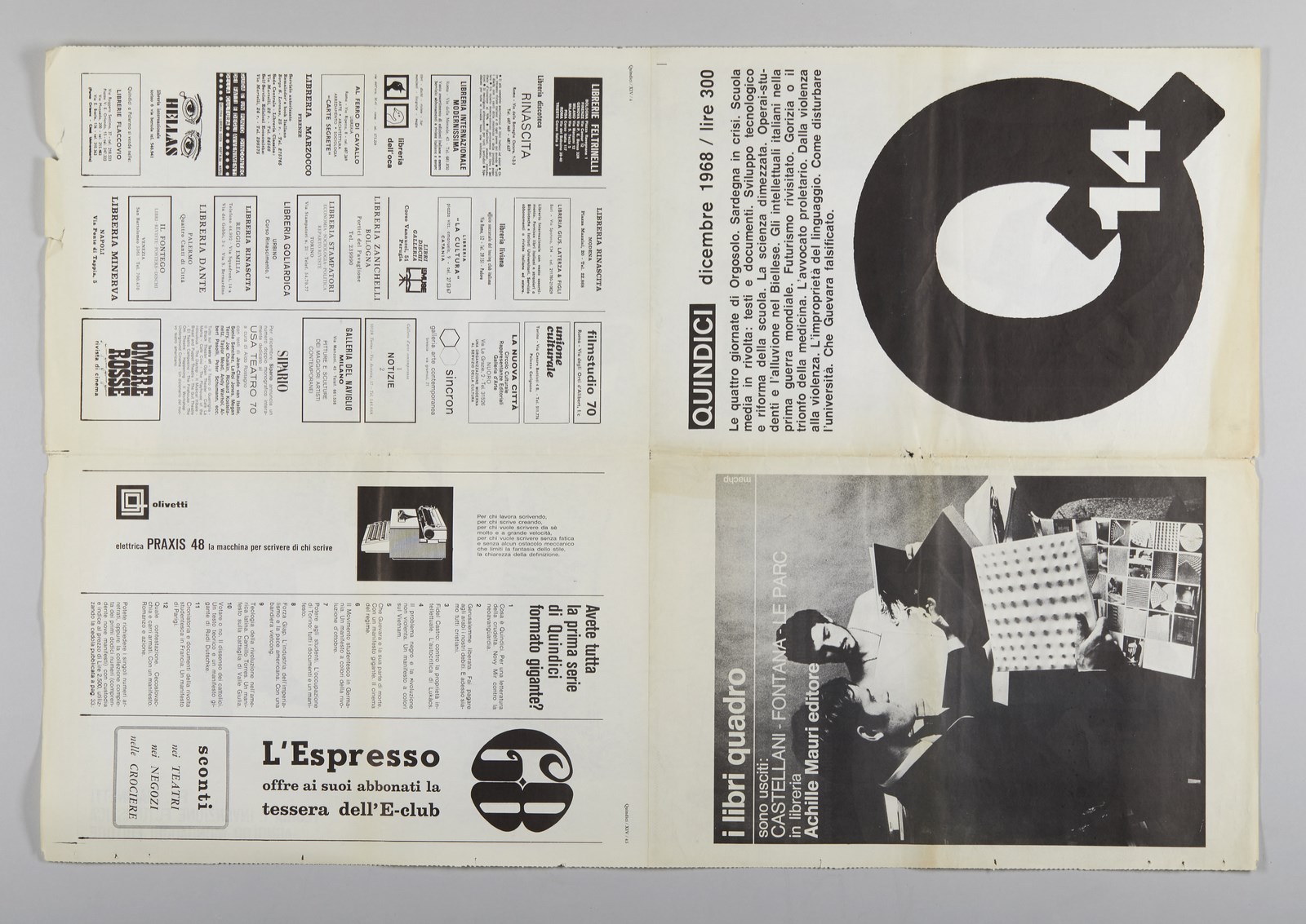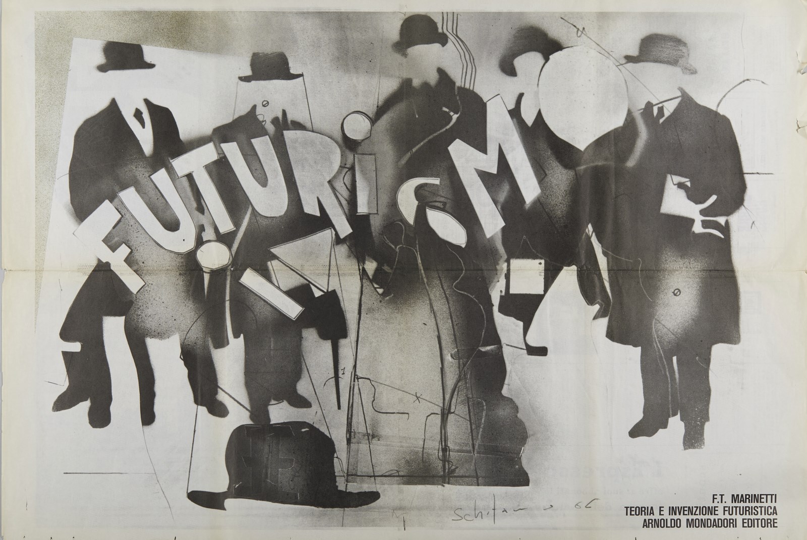 Riproduzione su foglio di giornale dell'opera di Schifano, Futurismo, 1966. Rivista: Quindici, dicembre 1968. «Quindici» è l'ultima rivista del Gruppo 63, pubblicata a Roma dal 1967 al 1969. Il periodico, mensile fino al 1968, poi bimestrale, non dava spazio solo alla letteratura, ma anche alla politica, al costume e alle scienze umane.
