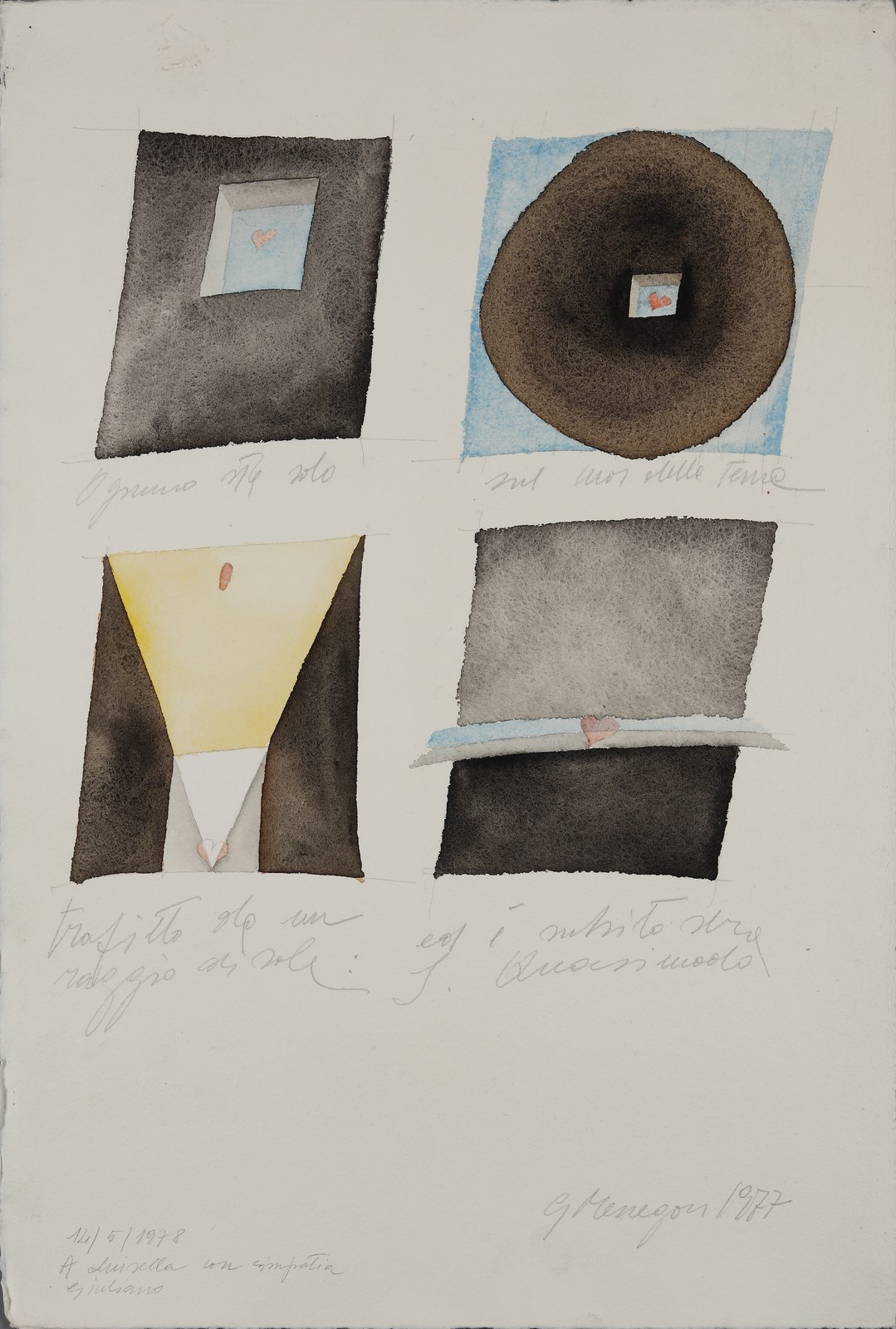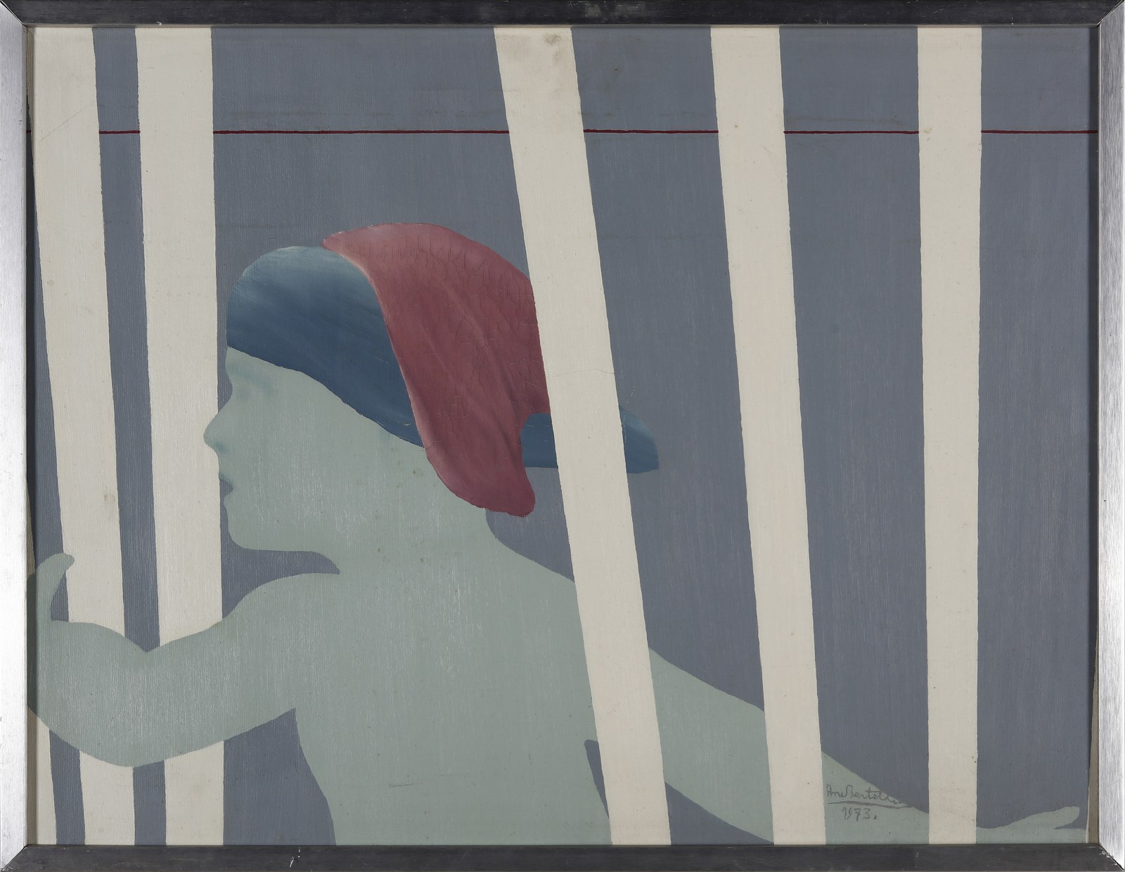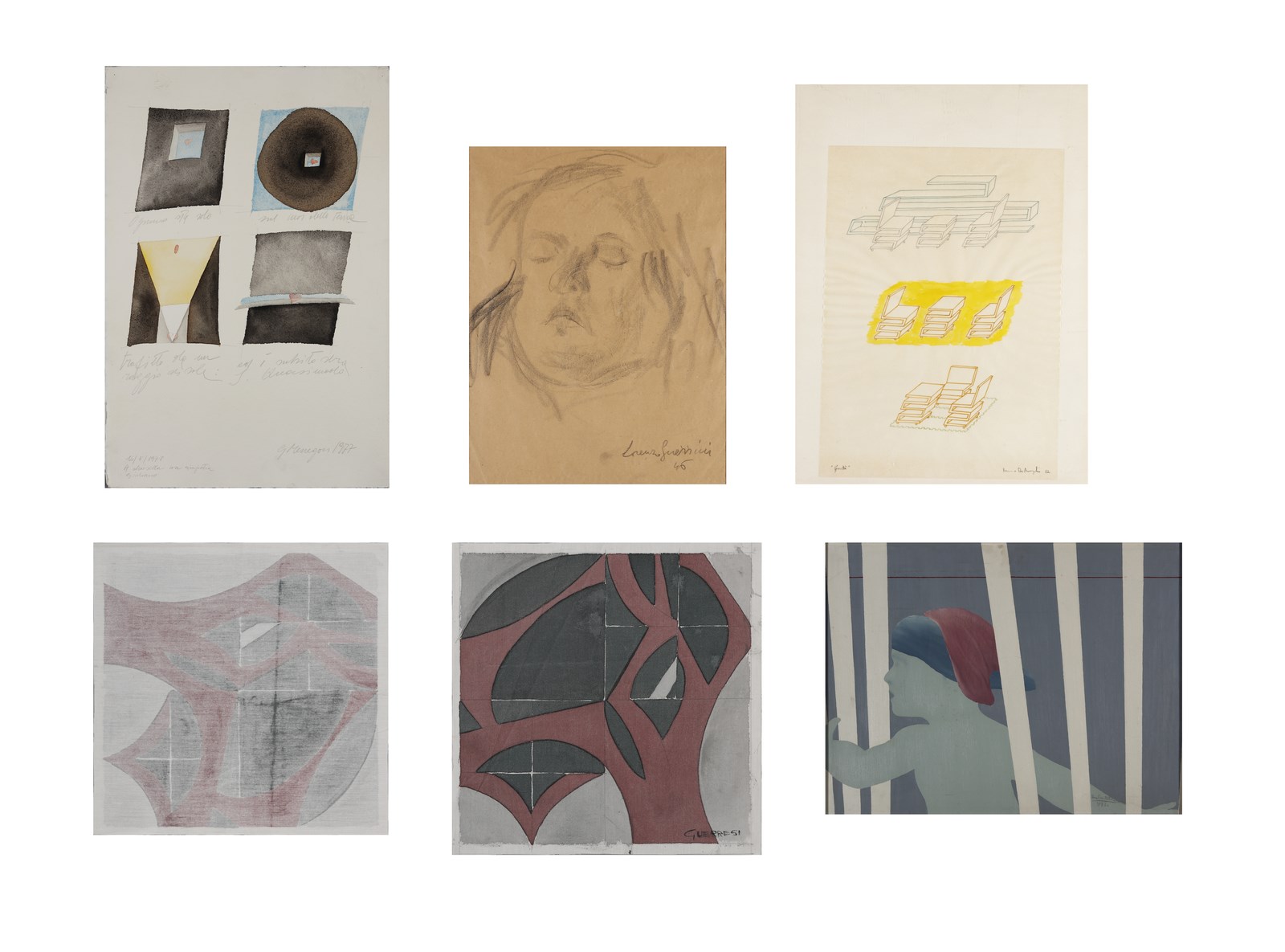 1. Menon Giuliano. Tecnica mista su carta, 38x56.5 cm. 1977, Dedica, firma e anno in basso a matita.2. Guerresi Patrizia. Tecnica mista su tela. 32x32 cm. Firma in basso a destra.3. De Angelis Bruno. Tecnica mista su carta. 23x32 cm. 1982. Titolo, firma e anno in basso.4. Guerrini Lorenzo. Matita grassa su carta. 19.5x26.5 cm, 1946. Firma e anno in basso a destra.5. Bertelli Andrea. Olio su tela. 59x45 cm. 1973. Firma e anno in basso a destra. Al retro firma e titolo (Bambina che corre).