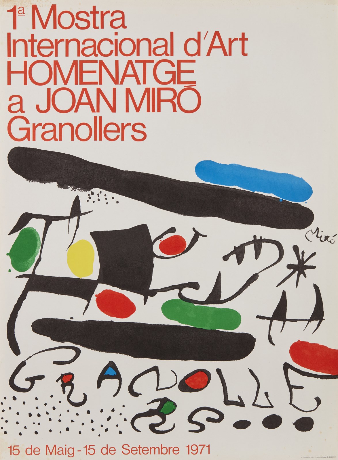 Poster 1ª Mostra Internacional d'Art Homenatge a Joan Miró, Granollers. Stampa: La Polígrafa, S.A., Barcelona. Lievi difetti.