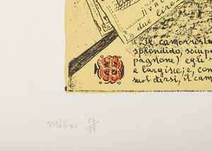 87/99. Tiratura e firma in basso a sinistra a matita. Timbro a secco Stamperia Posterula, Urbino. Difetti.