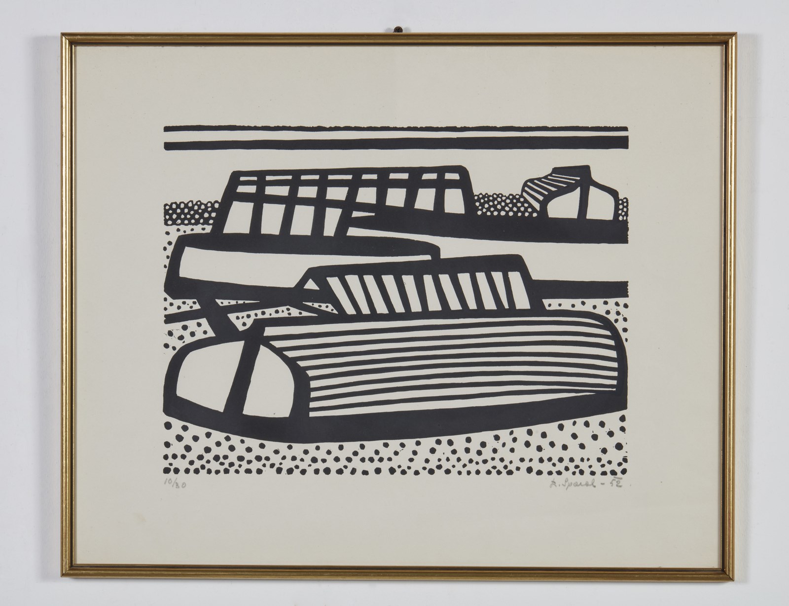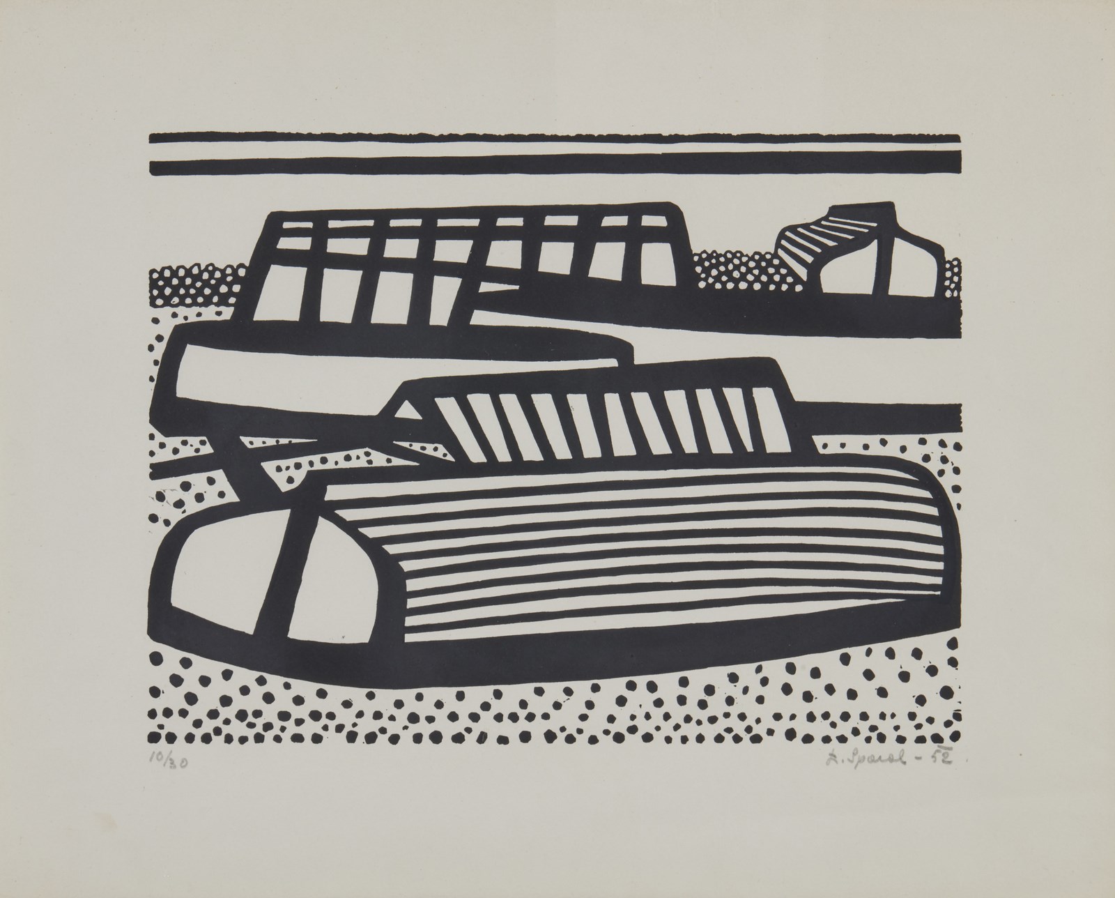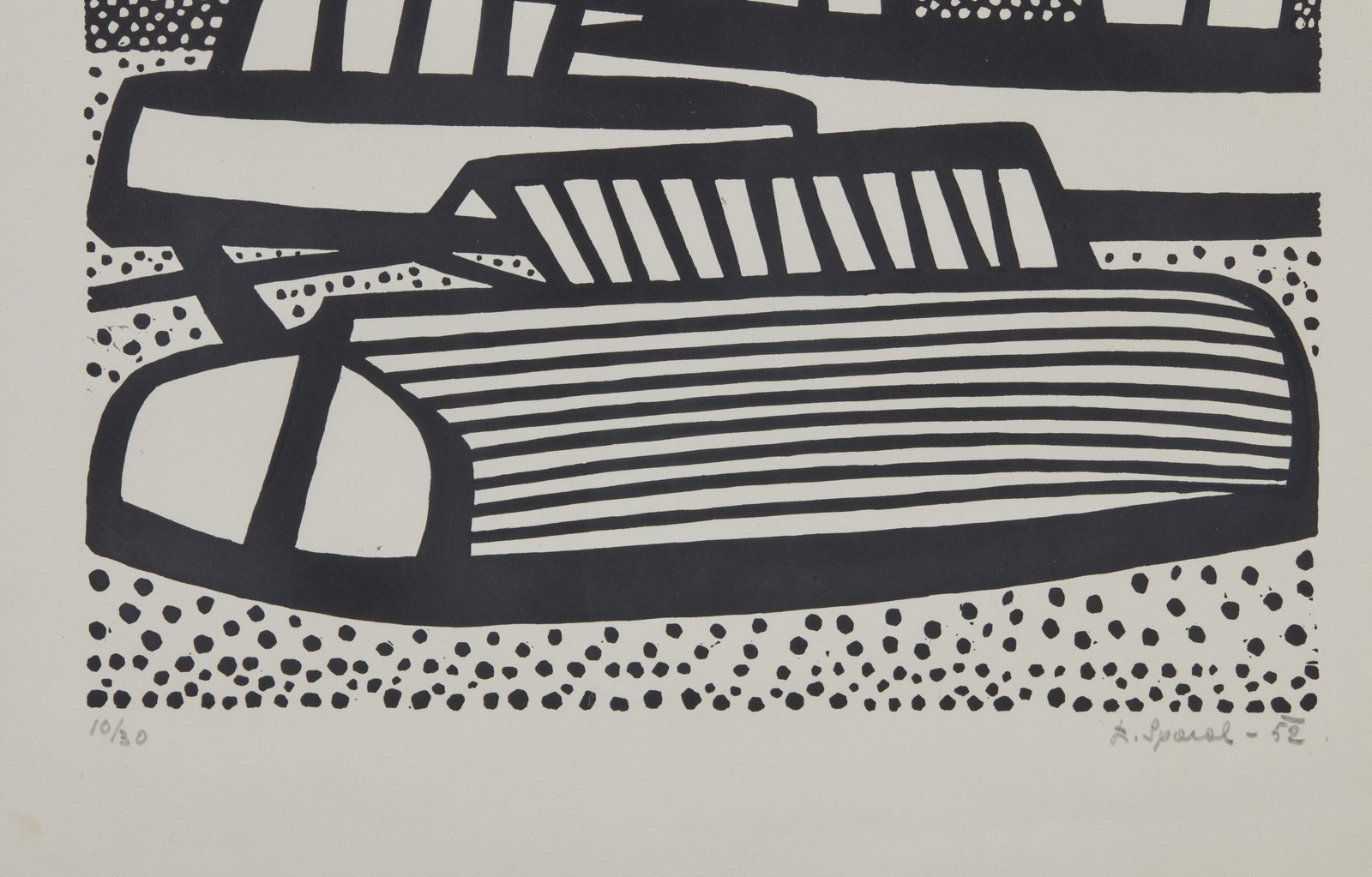 10/30. Tiratura, firma e anno in basso a matita. Lievi difetti. Esposizione: Luigi Spacal - opere grafiche, 13 Aprile - 14 Maggio 1983, Galerie Rive Gauche, Roma. Lievi difetti.