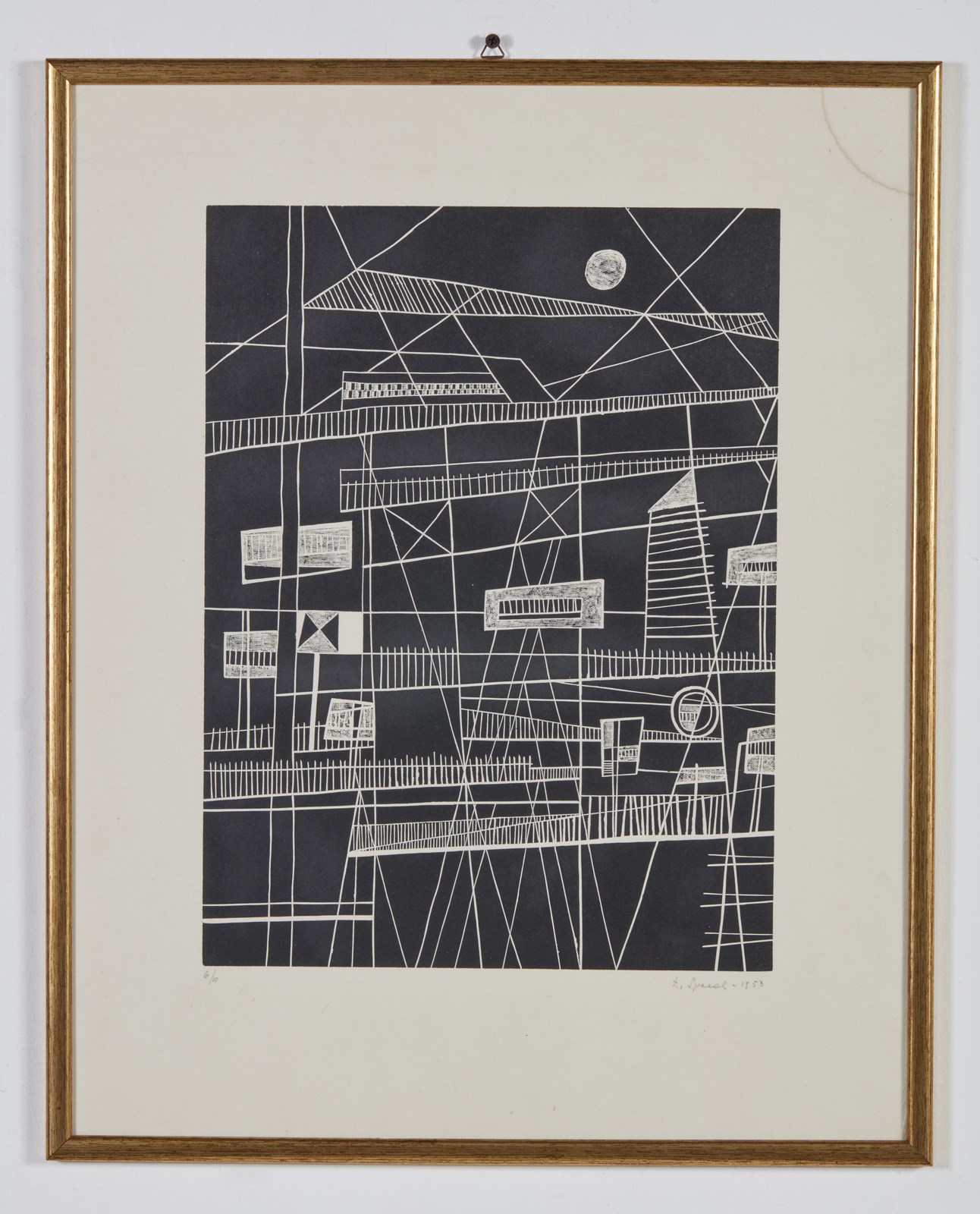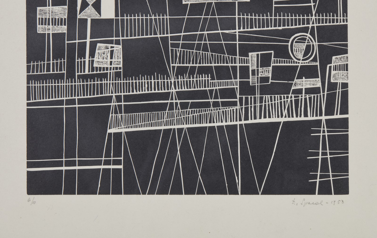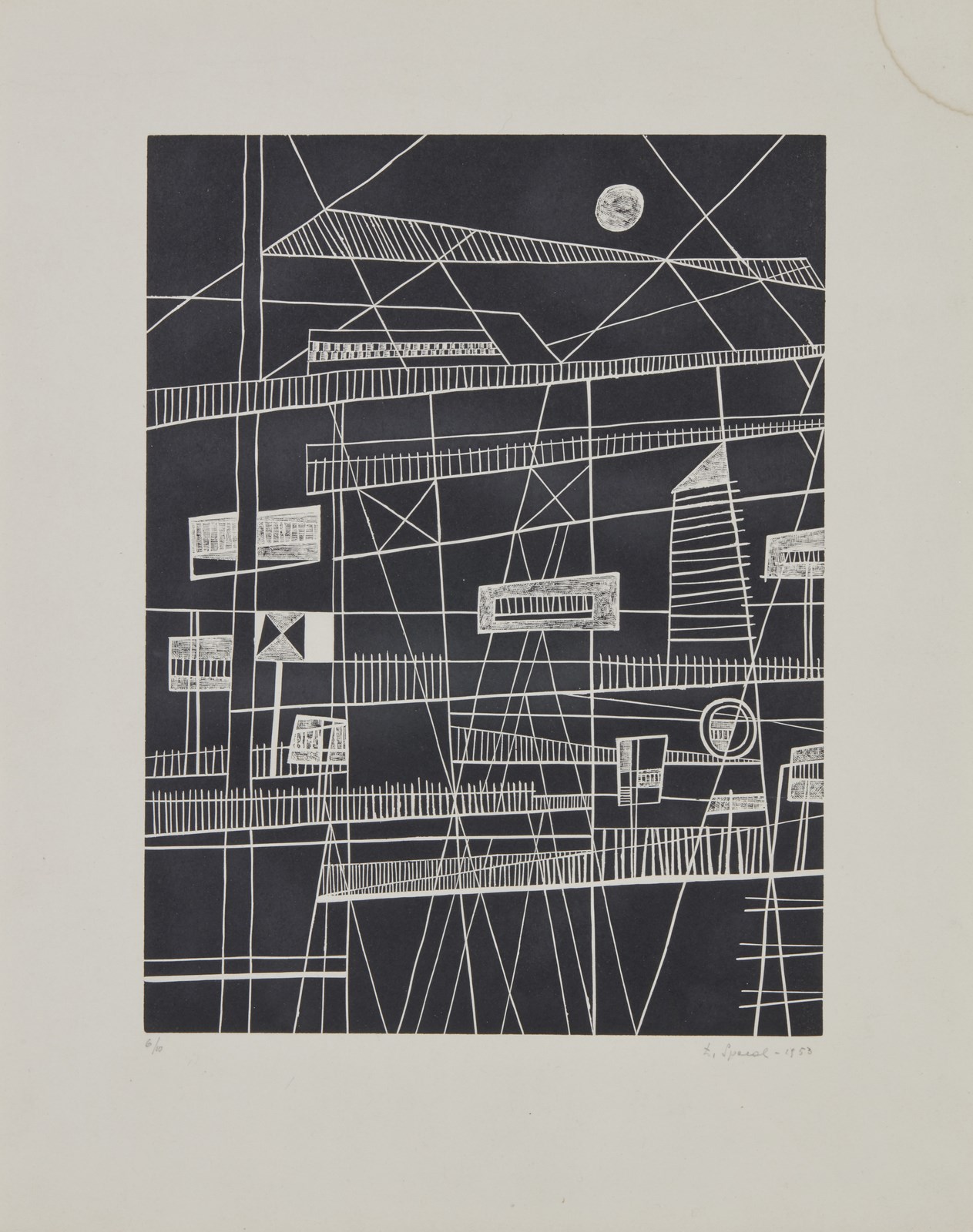 6/10. Tiratura in basso a sinistra, firma e anno a matita in basso a destra. Lievi difetti. Dimensione lastra: 40x30cm. Esposizione: Luigi Spacal - opere grafiche, 13 Aprile - 14 Maggio 1983, Galerie Rive Gauche, Roma.Lievi difetti.