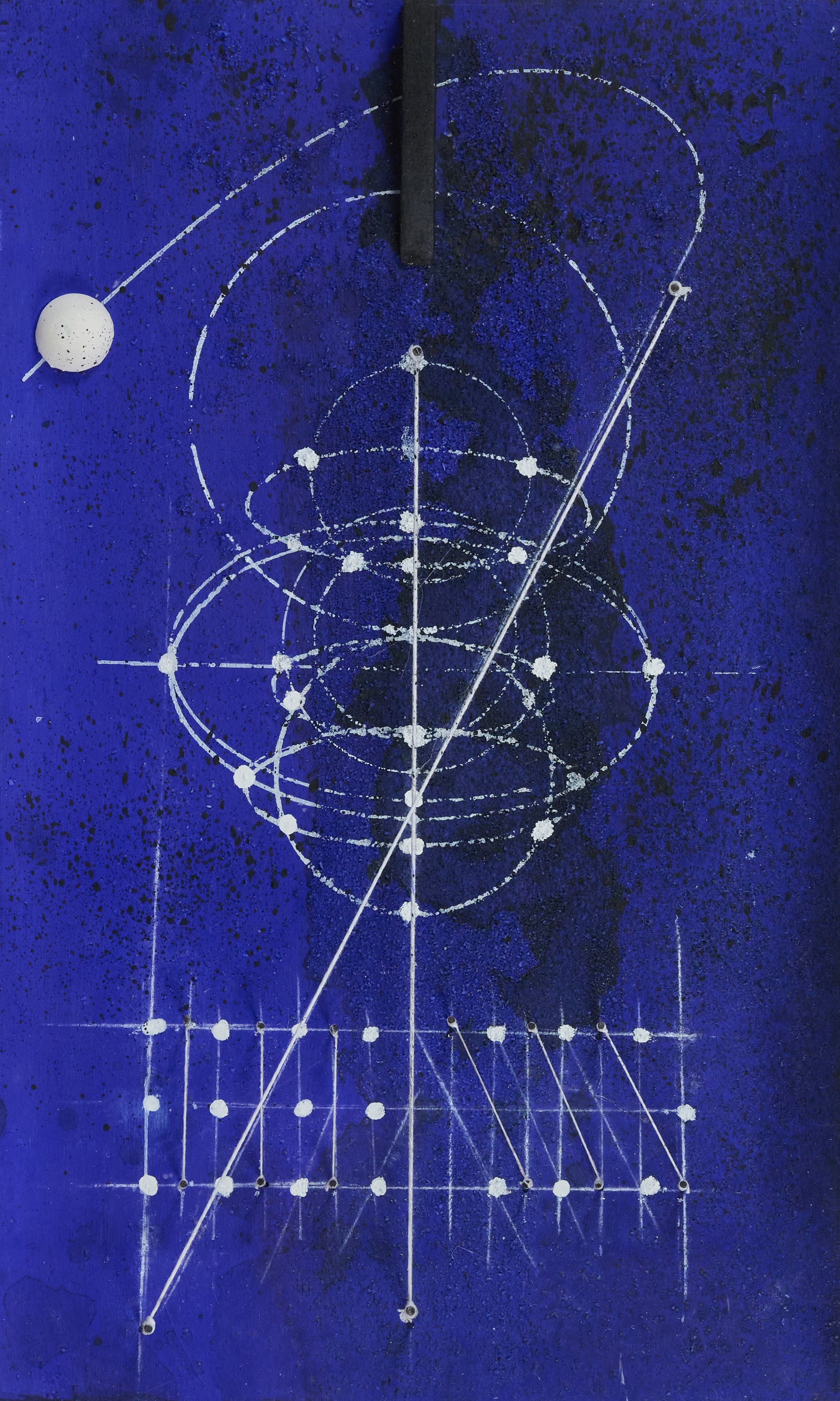 Tecnica mista, applicazioni e fili su tavola, cm. 37x22,5x4, in teca di plexiglas