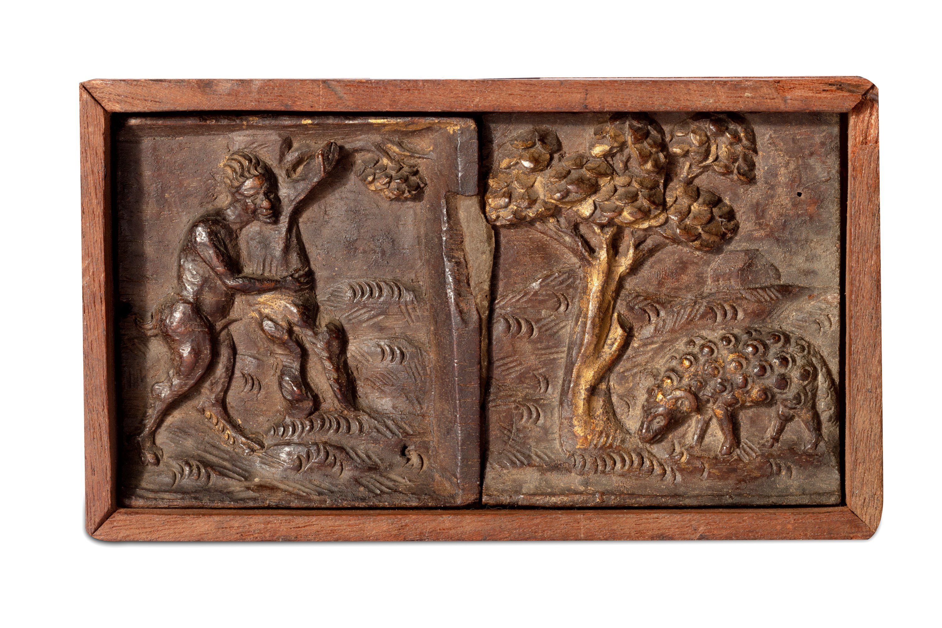 Antico bassorilievo in legno raffigurante satiro e pecorella entro paesaggio