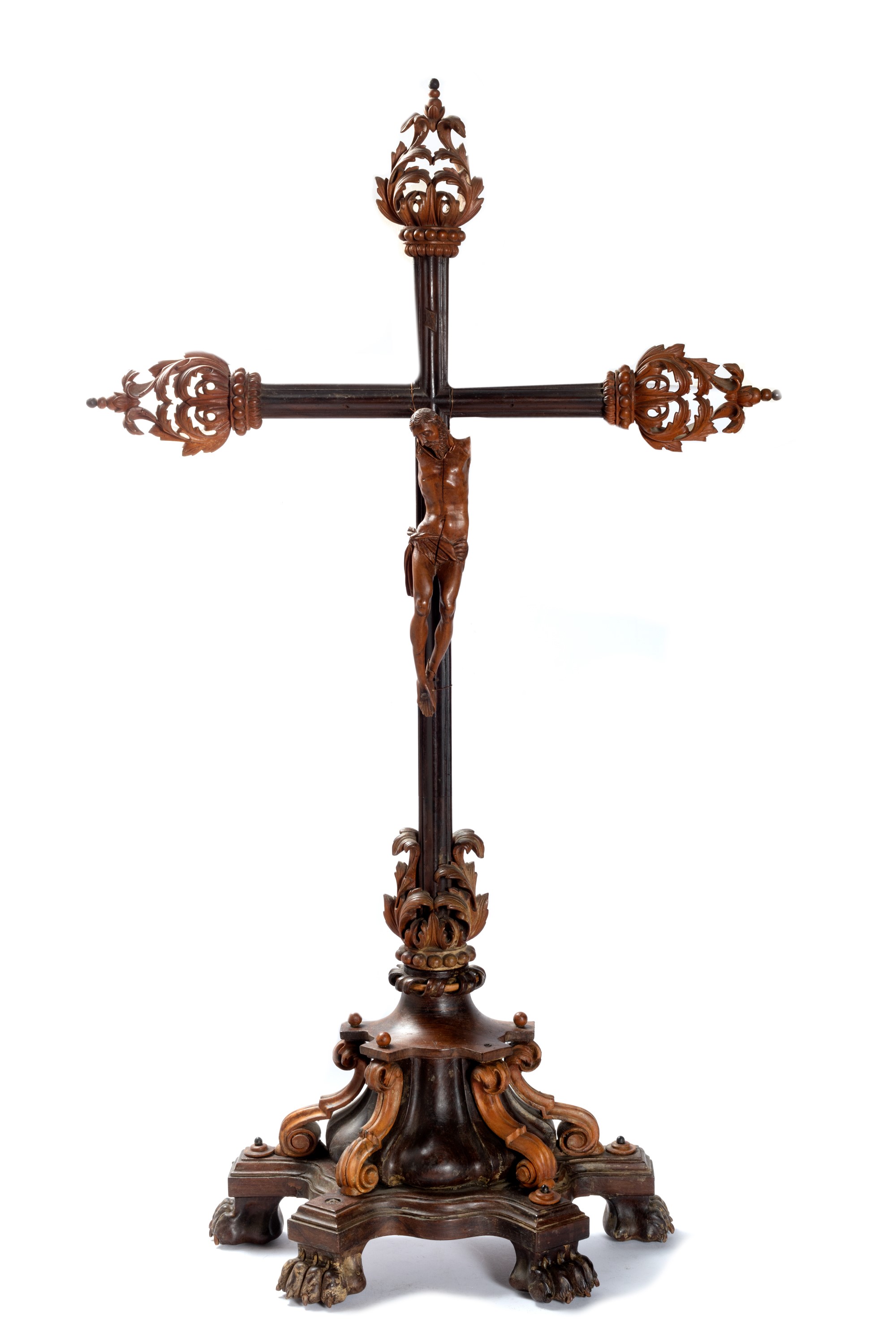 figura di Cristo ed estremità della croce finemente intagliate in legno di bosso; base decorata con volute e piedi ferini